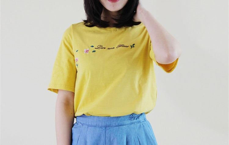 The T-shirt rendered in yellow has a full sense of age reduction, and at the same time It also has a good skin-lifting effect. The loose fit is not flattering on your figure, making it casual and comfortable to wear. The three-dimensional embroidery pattern breaks the dullness of solid colors and makes it more beautiful and moving.