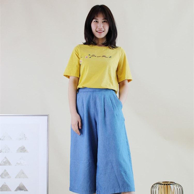 Loose and casual T-shirt, comfortable and casual to wear. The three-dimensional embroidery pattern is exquisite and beautiful, adding beauty to the details. Paired with a pair of high-waisted casual pants, the eight-quarter length of the pants exposes slender calves, making the figure even more prominent. The blessing of white shoes on the feet is simple and elegant.