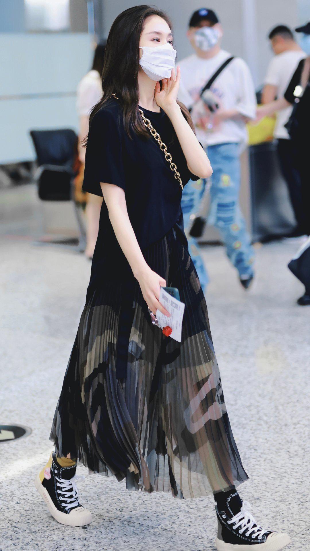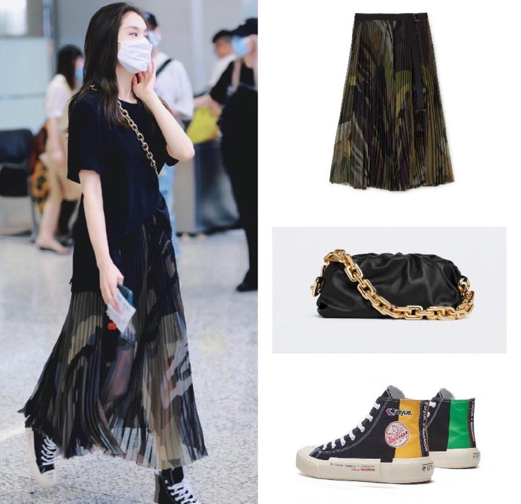 In fact, whether it is a black T-shirt or a pleated skirt, they are relatively versatile items. Therefore, you can choose freely when matching shoes. However, in order to increase the comfort of the outfit, Wang Ziwen’s high-top canvas shoes are still very good and make the outfit more casual. Moreover, the contrasting color design makes the style more personalized and fashionable, and makes it more youthful and energetic.