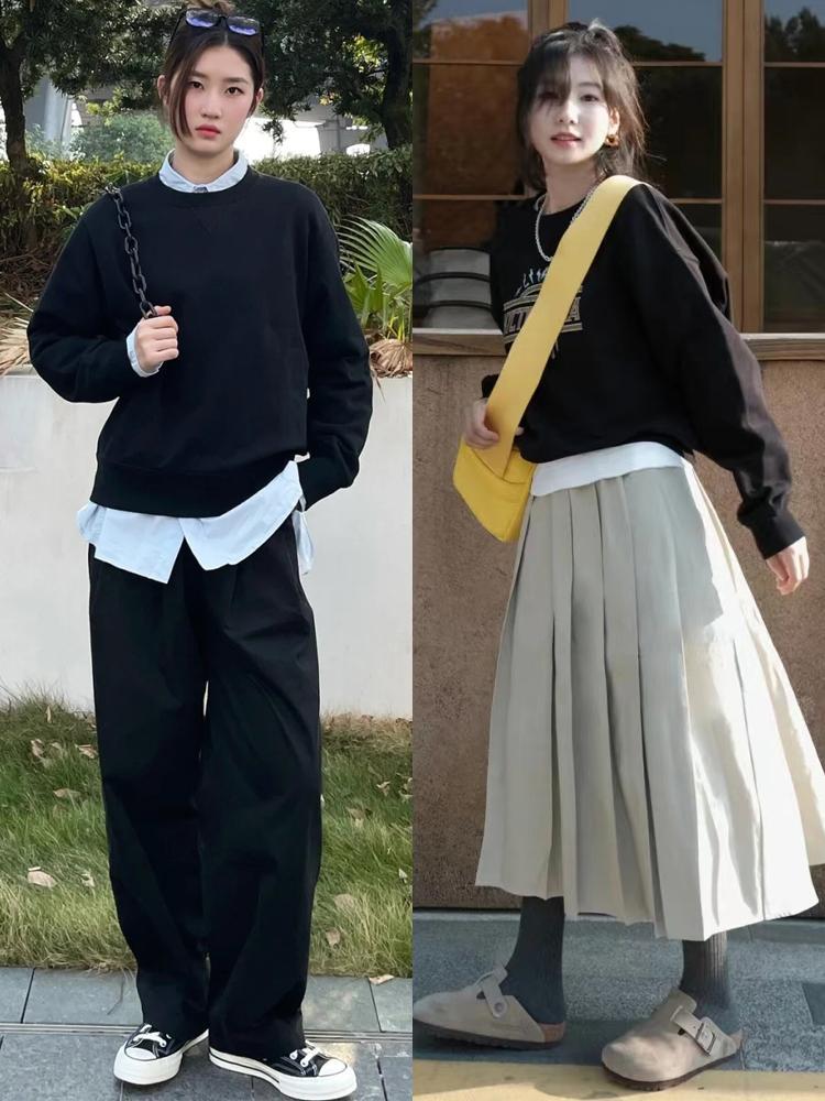 Black wide-leg pants are the first recommended item to match. They are versatile, not picky and can be easily controlled, but you must be careful when matching them. Pay attention to clothing color matching. Especially when wearing a black sweatshirt, the color of the layered tops is directly related to the body proportions, and is also the key to weakening the oppressive feeling of black clothing.