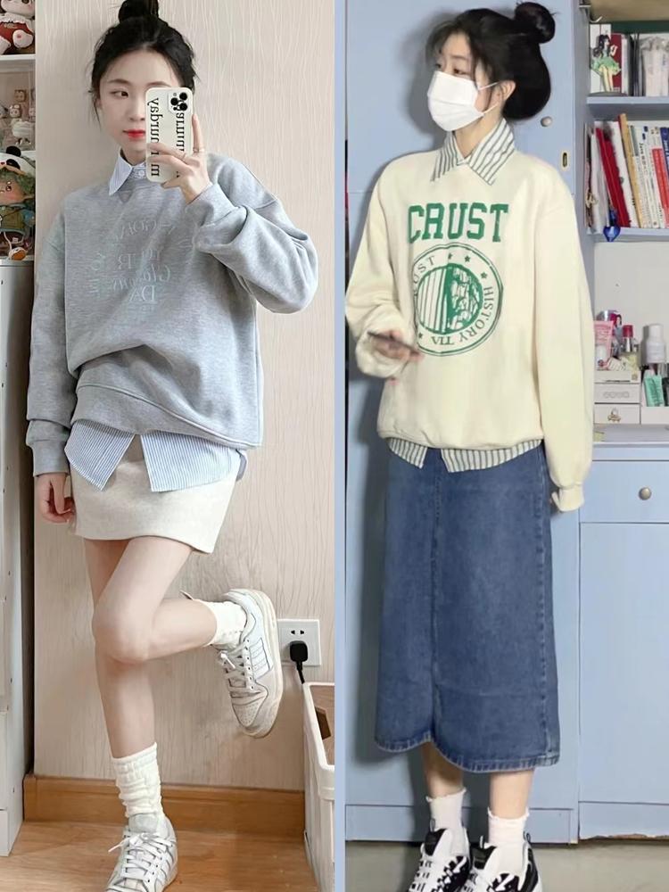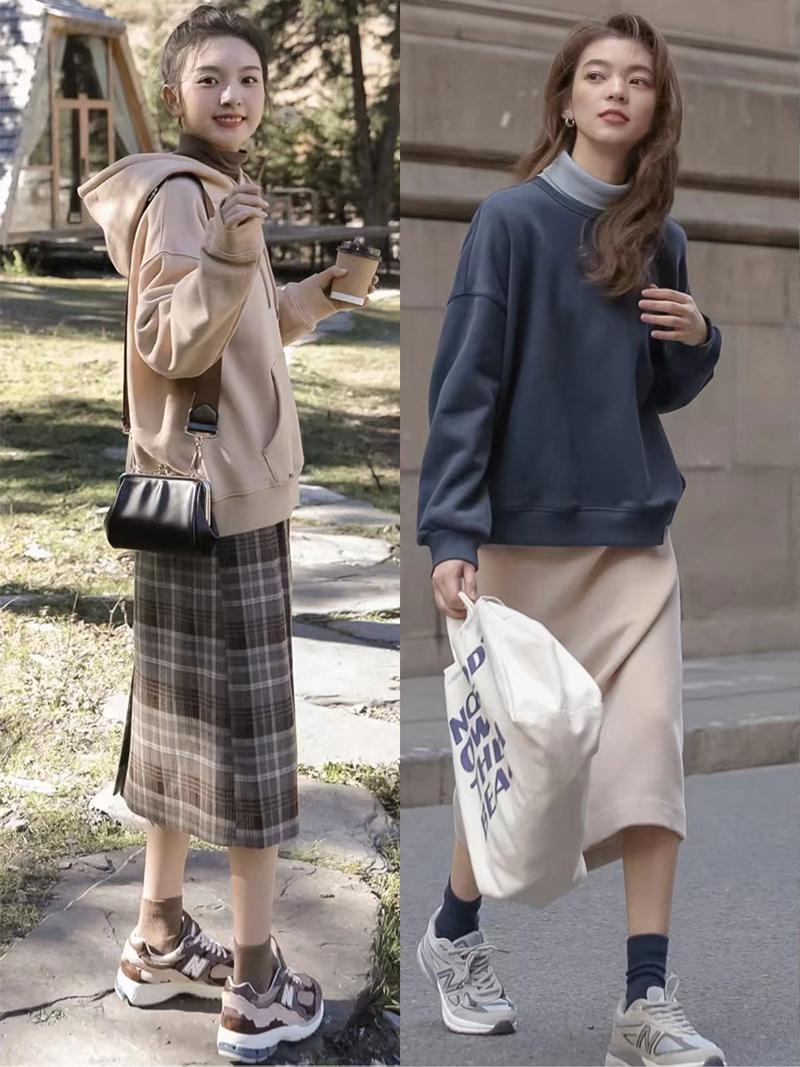 In addition to wide-leg pants, sweatshirts layered with skirts are also very tolerant, and can well reflect female charm and elegance.