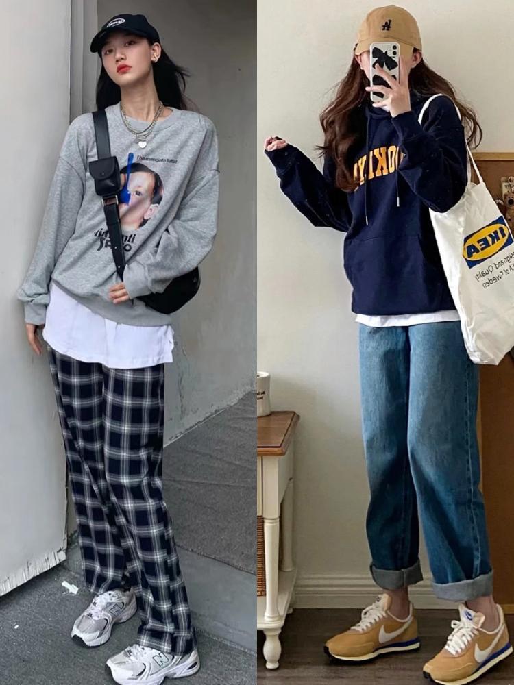 In addition, sisters can also enhance their sense of fashion through the material of their pants, such as choosing some wide-leg pants with style characteristics. Make your outfit instantly stylish. You can refer to the blogger’s matching ideas. The emergence of plaid and denim wide-leg pants instantly makes sweatshirts more fashionable.