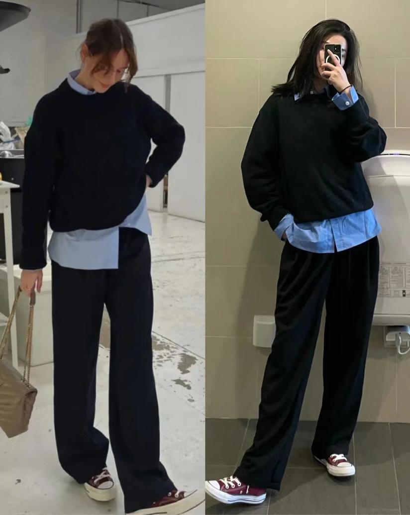 For example, the blogger’s sweatshirt style is the best proof. If the color of the blue shirt were not bright enough, the entire outfit would become very ordinary. There is also a lack of layering.