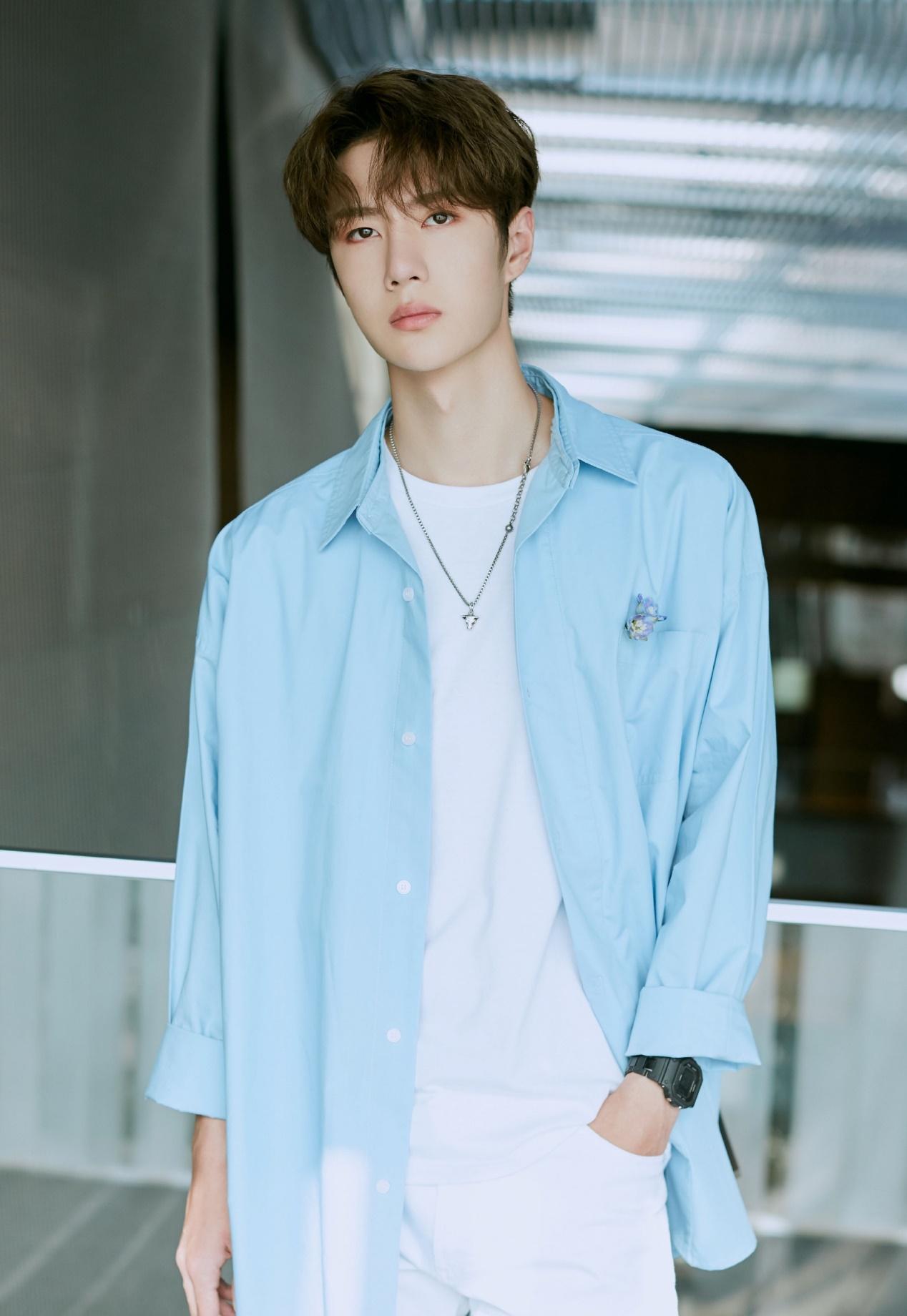 The color of this blue shirt happens to be a slightly whitish light blue. This cool color is very suitable for people with fair skin like Wang Yibo. It has an elegant and clean feeling when wearing it. Wear a white T-shirt underneath and a pair of white casual pants. The overall outfit is refreshing and handsome. It is indeed Wang Yibo’s ideal in the world.