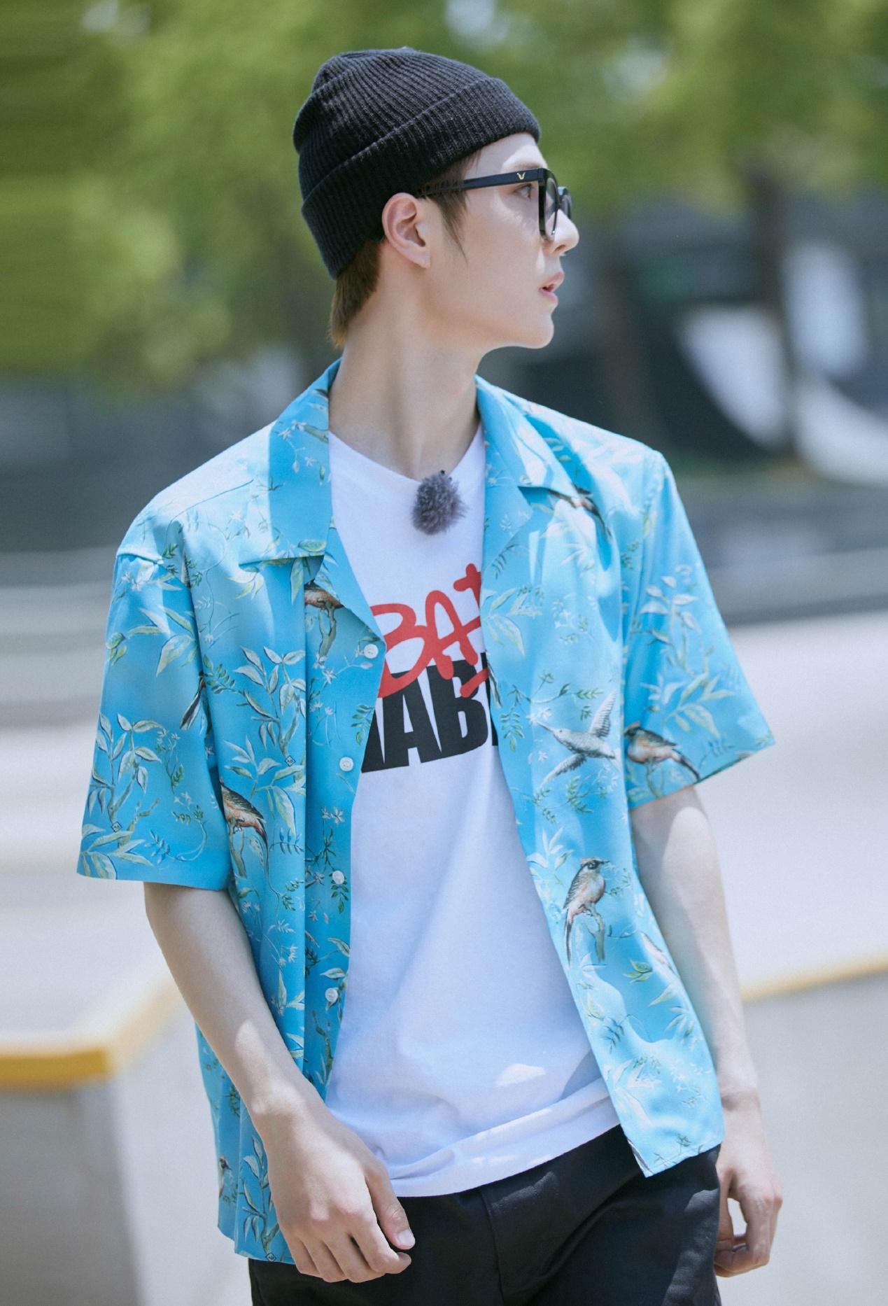 Shirt layering has always been a very classic way of dressing. It has a sense of age-reduction trend. Yibo Zhen wears a blue printed shirt. It is full of refreshing and handsome flavor, with a regular white T-shirt underneath. The overall outfit is simple and handsome, but the most eye-catching thing is Wang Yibo’s black woolen hat and frame glasses. It is a different Wang Yibo.