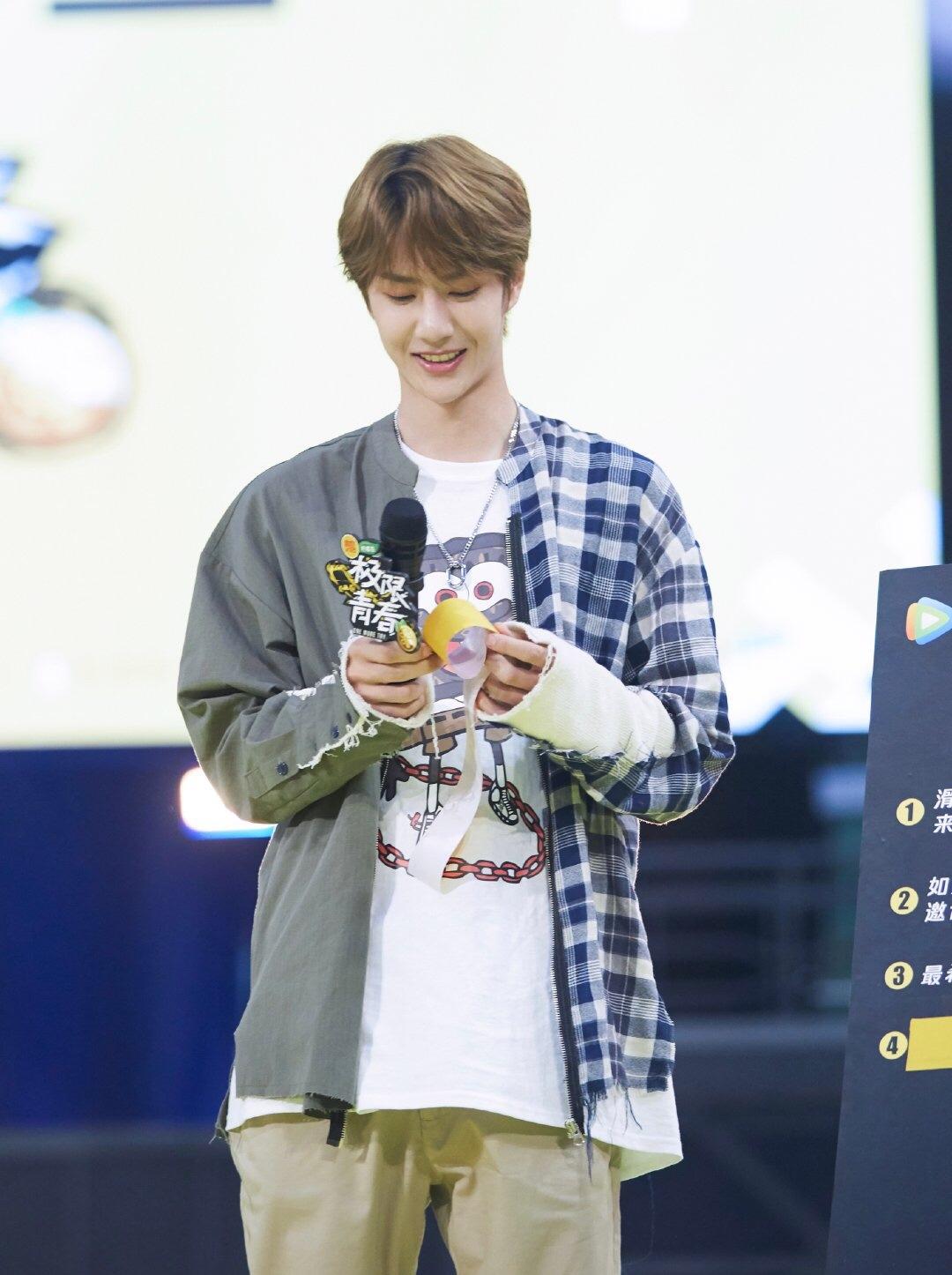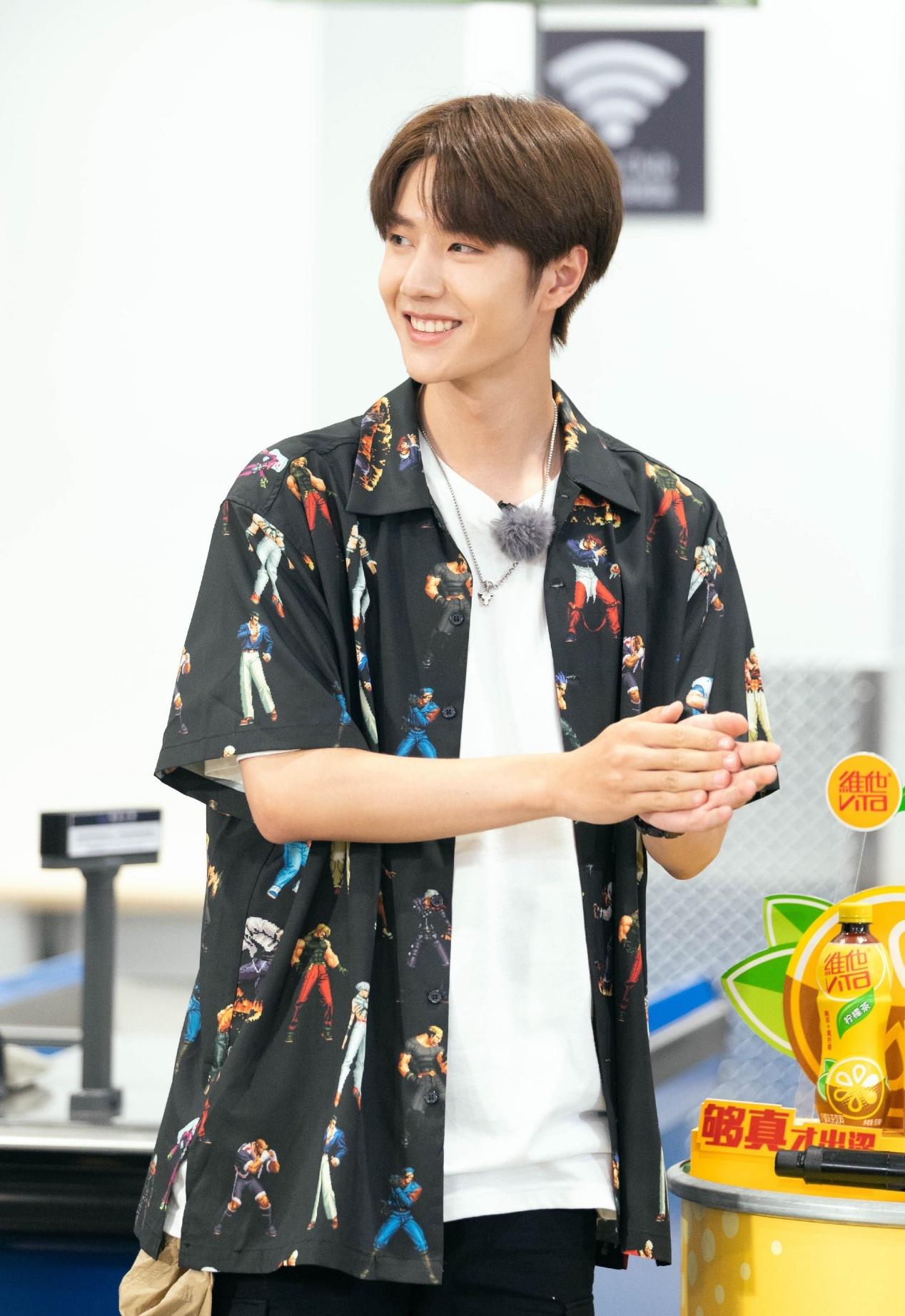 This patchwork shirt is really Korean style. It feels like a Korean boy when worn on the body. It has a printed shirt underneath. Wearing a white T-shirt and a pair of casual pants, the overall outfit is simple and handsome. Yibo is also very sunny and handsome when he smiles. He is sweet and cool.