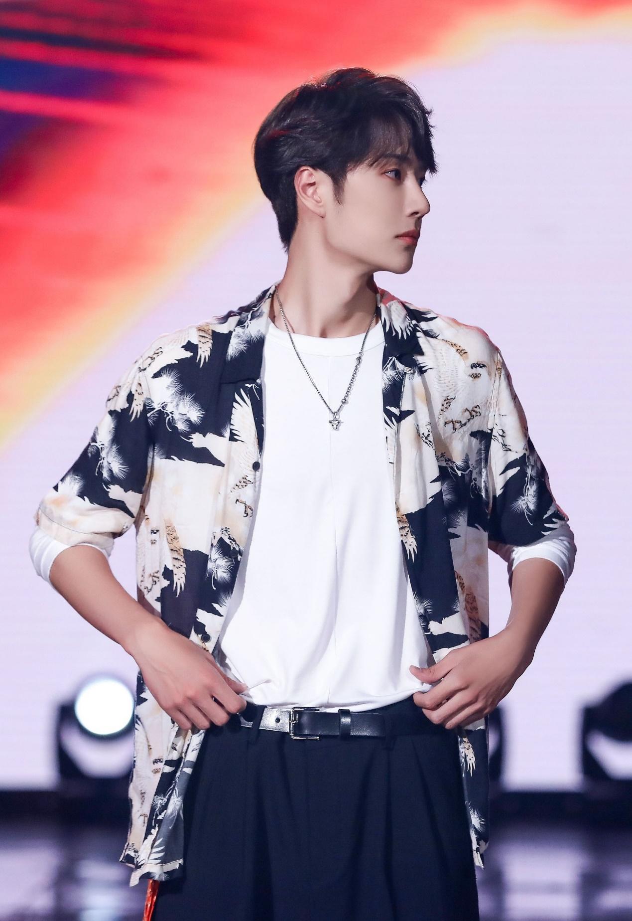 If you want to show the taste of summer, this black and white printed shirt is also indispensable. A white T-shirt is worn under Yibo, and a black casual pair is worn underneath. pants, the overall outfit is very Korean trendy, and Yibo also ties the T-shirt inside the pants, which can perfectly elongate the body line. Have you got such a high-profile secret?