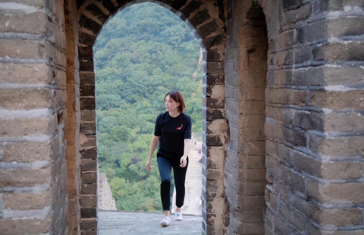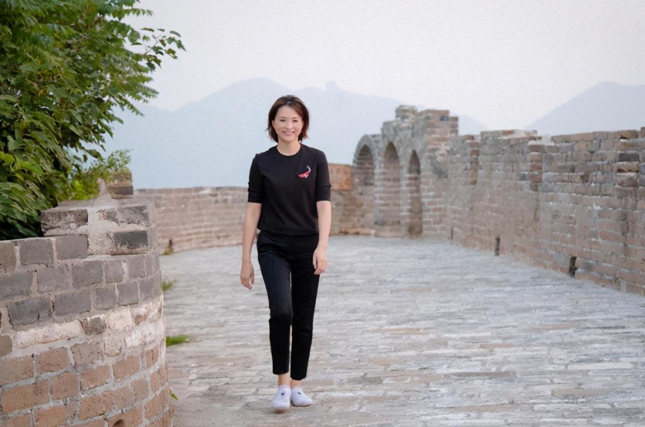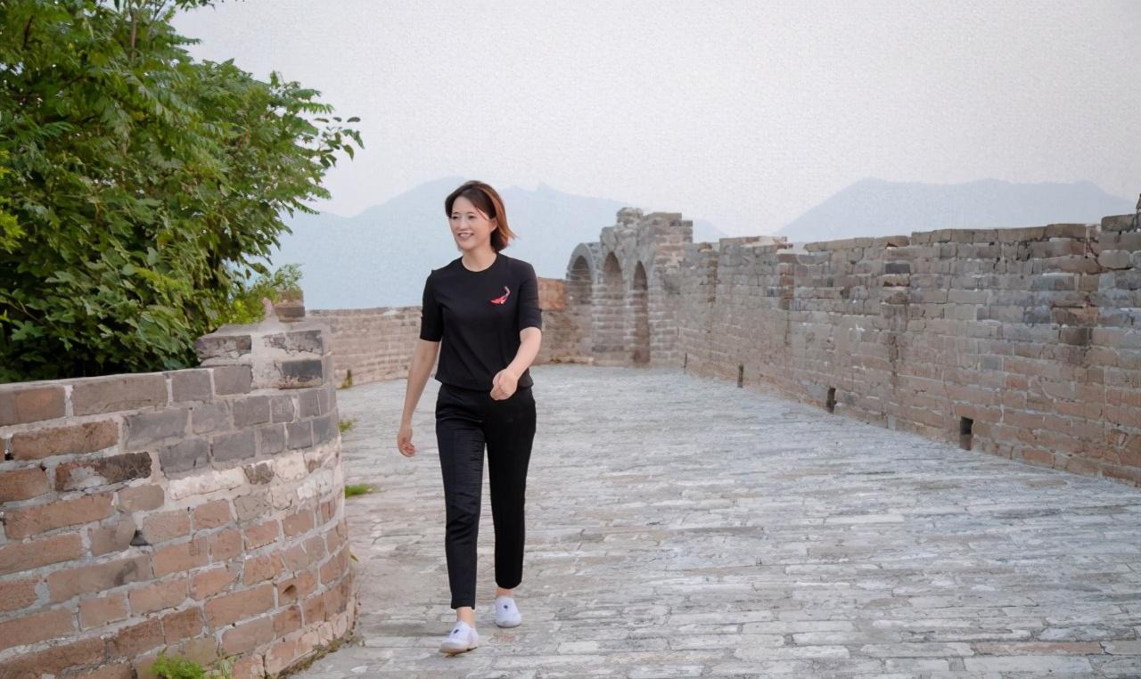 So, Dong Qing is really low-key and casual in her private life. She wears a T-shirt and black leggings to climb the Great Wall. She is a 47-year-old middle-aged man. The person is also very girly.