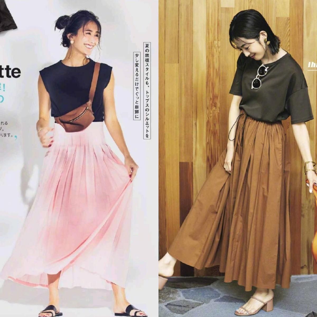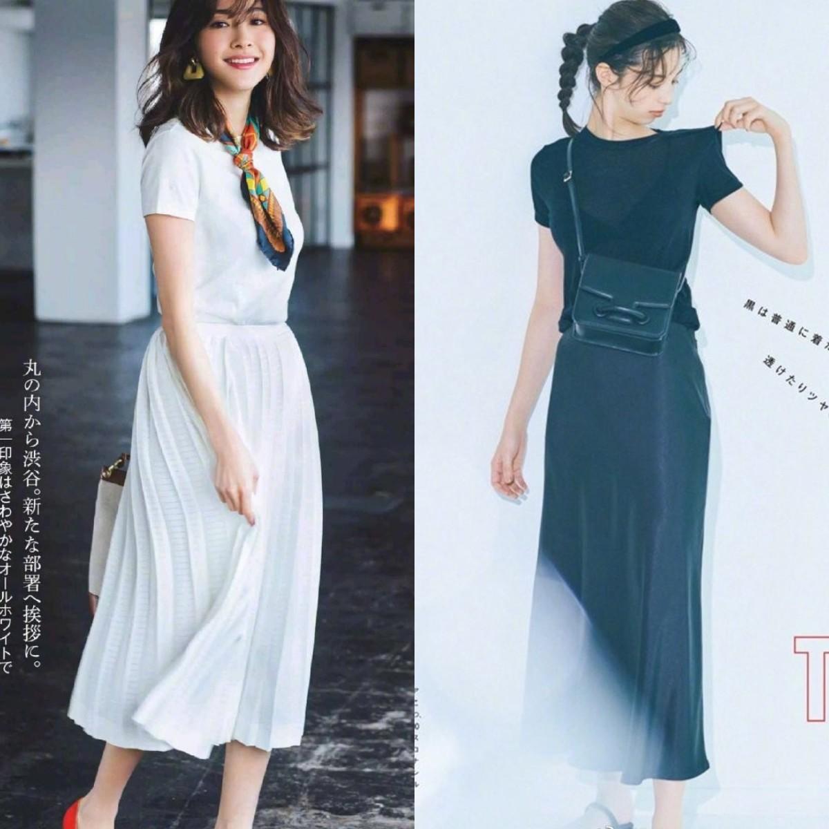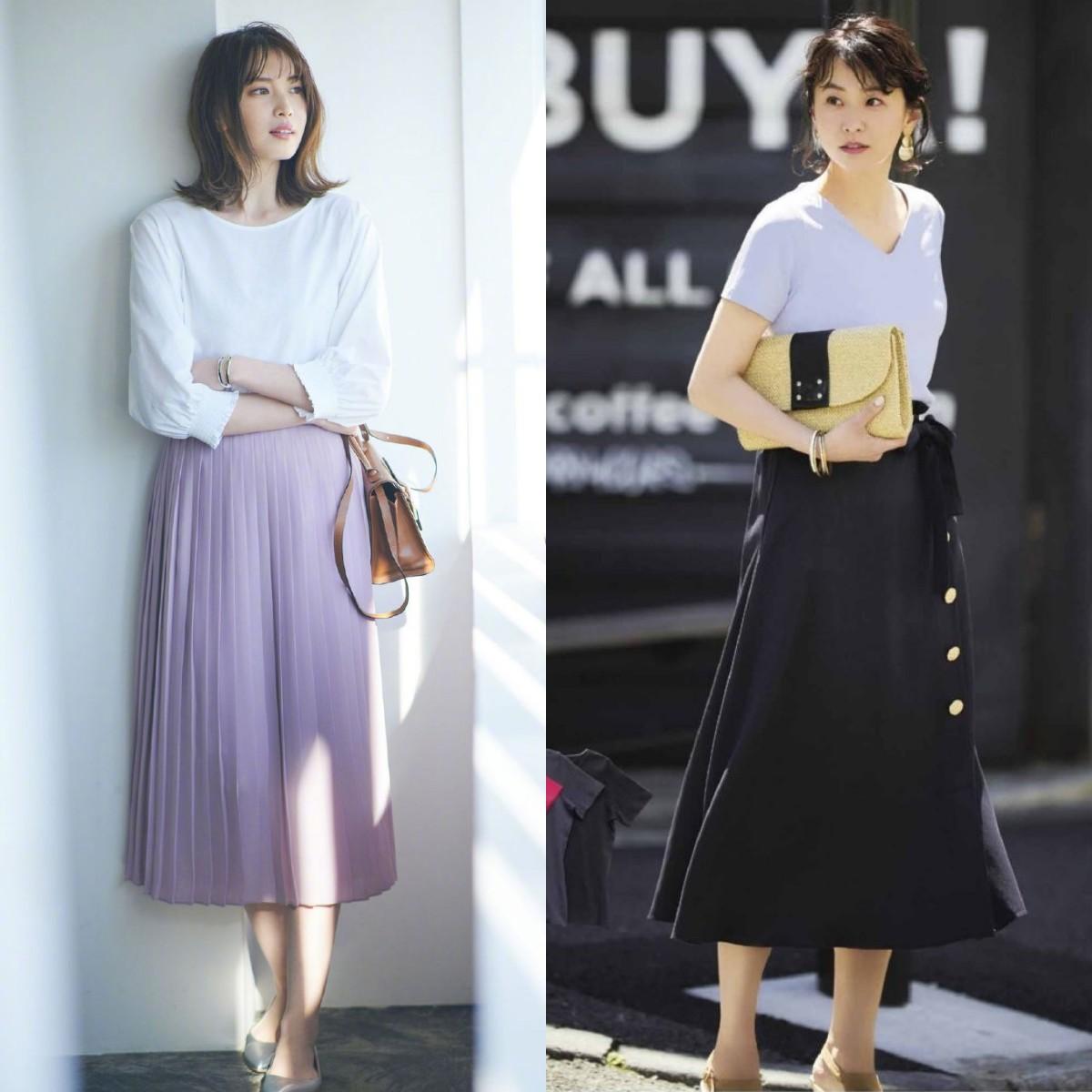 In daily life and work, it is difficult to wear the same color. Matching T-shirts and skirts of different colors is easier and more practical. . The combination of “light on top and dark on the bottom” is a more common way of dressing. Light-colored T-shirt Refreshing and bright, it can brighten the skin tone, and the dark skirt can modify the lower body shape, like this The matching method is very friendly to sisters with pear-shaped figures.