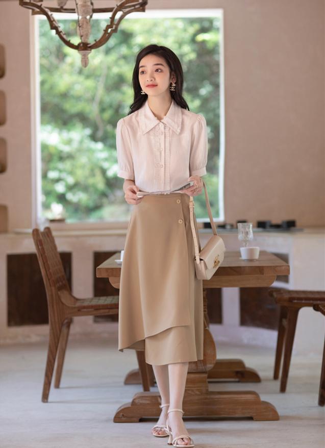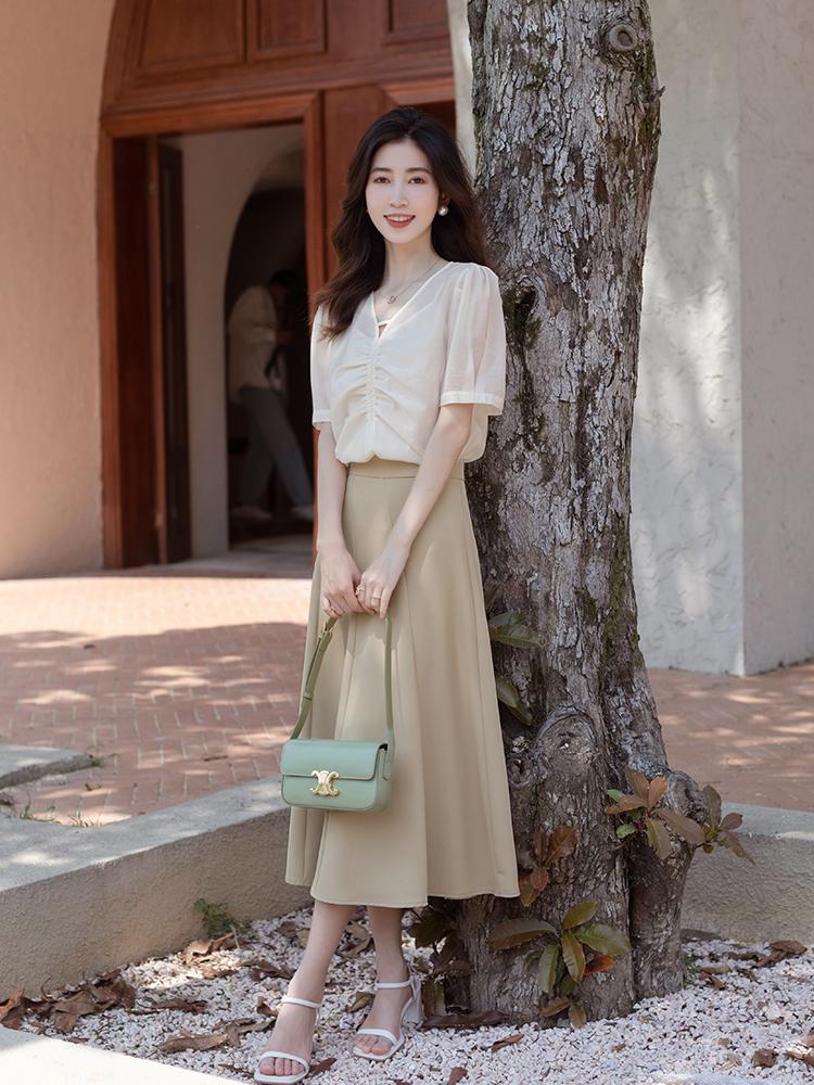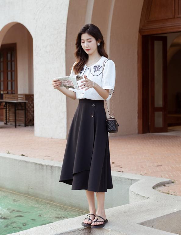 If you want to make your outfit more advanced, you can buy an A-line skirt with a softer texture and a T-shirt to add a high-end texture and make your look more elegant and intellectual.
