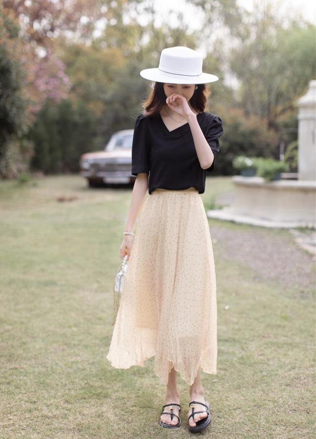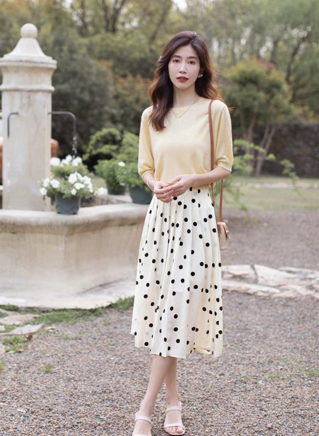 The most unmissable way to wear this spring and summer is: That must be the combination of a T-shirt and a polka-dot skirt. The polka-dot skirt has a French romantic atmosphere. When paired with a solid color T-shirt, it can not only create an elegant and elegant look, but also break the monotony of solid colors, making your outfit more eye-catching.
