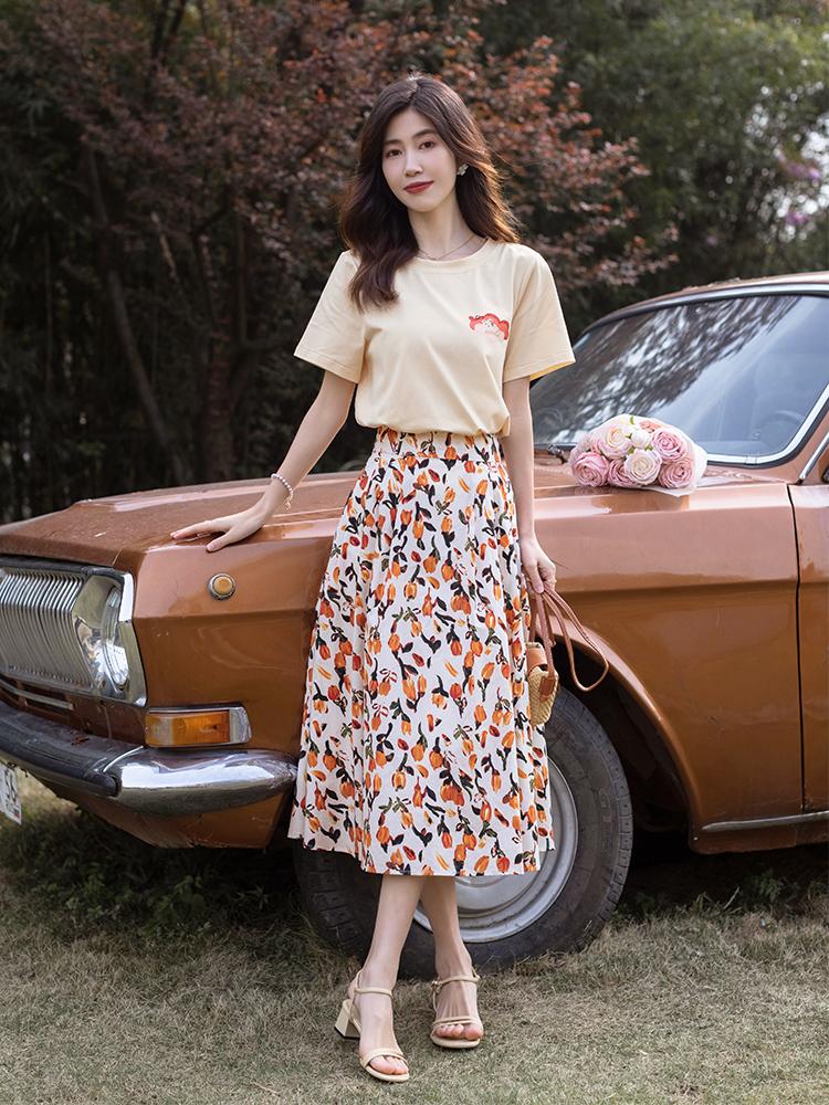 Of course, if you want to wear a more head-turning look, you can also choose a large printed skirt with a brighter color. It can not only enhance the brightness of the matching, enrich the color sense of the style, but also prevent the matching from being too out of the ordinary. It is very suitable for women in their thirties and forties to create light and mature style outfits. However, in terms of the color of the matching T-shirt, we can try more tender candy colors. Paired with a large printed skirt, it can not only have an age-reducing effect, but also avoid the suspicion of pretending to be young.
