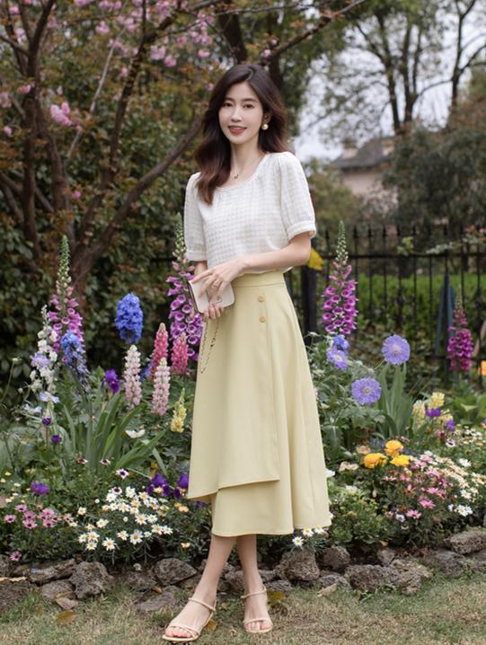 In addition, we can also choose to add an A-line skirt with an irregular skirt design and a T-shirt combination, like the splicing in the picture below The combination of an A-line skirt and a T-shirt is a great choice. It not only enhances the sense of design and reduces the chance of matching clothes, but also makes your outfit look more advanced and fashionable.