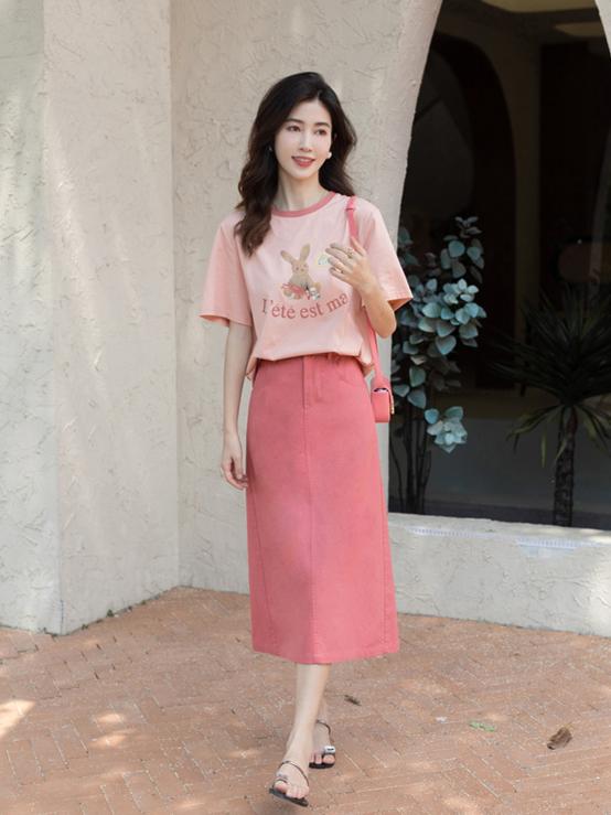 T-shirt and denim skirt combination It is more common in spring and summer. It can not only give a casual look, but also create an age-reducing and energetic style. If you have troubles with thick legs and wide hips, it is more recommended for you.Pair a straight-cut or A-line denim skirt with a T-shirt. At the same time, tuck the hem of the T-shirt into the waist of the skirt to tighten the waistline. It can not only cover the shortcomings of the legs and crotch, but also highlight the small waist, make the legs slimmer and longer.