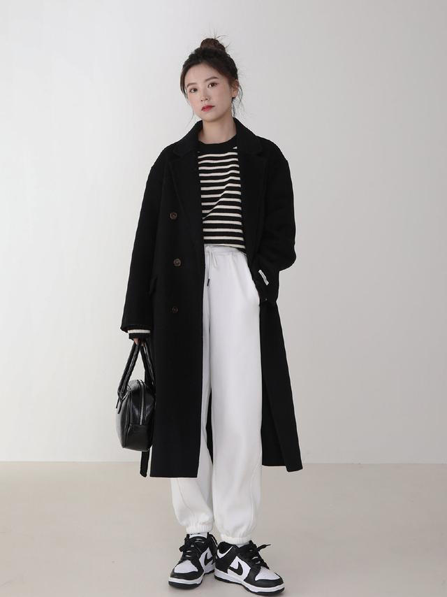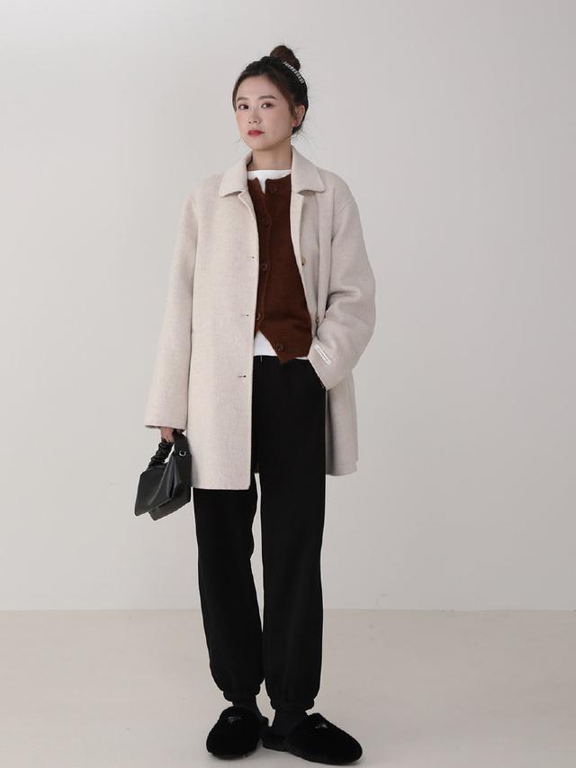 If you want to wear an A and casual look, Then you can choose a coat to match a sweater + sweatpants. The two styles collide with each other, which can not only enrich the style, but also keep warm and keep out the cold. A beige mid-length coat, paired with a brown knitted cardigan and black sweatpants, is simple and casual, unobtrusive but still very fashionable.