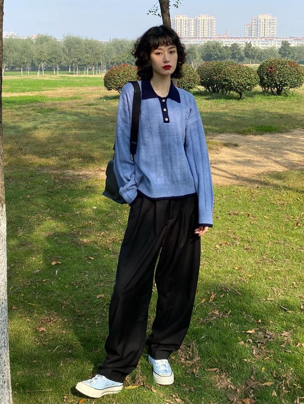POLO shirts and bell-bottom pants are both Hong Kong-style items. When combined together, they can create a modern retro temperament. But if you want to better interpret the retro style, it is best to choose floor-length wide-leg pants to create a contrast between short top and long bottom, which will make it look more casual and advanced, and very modern.