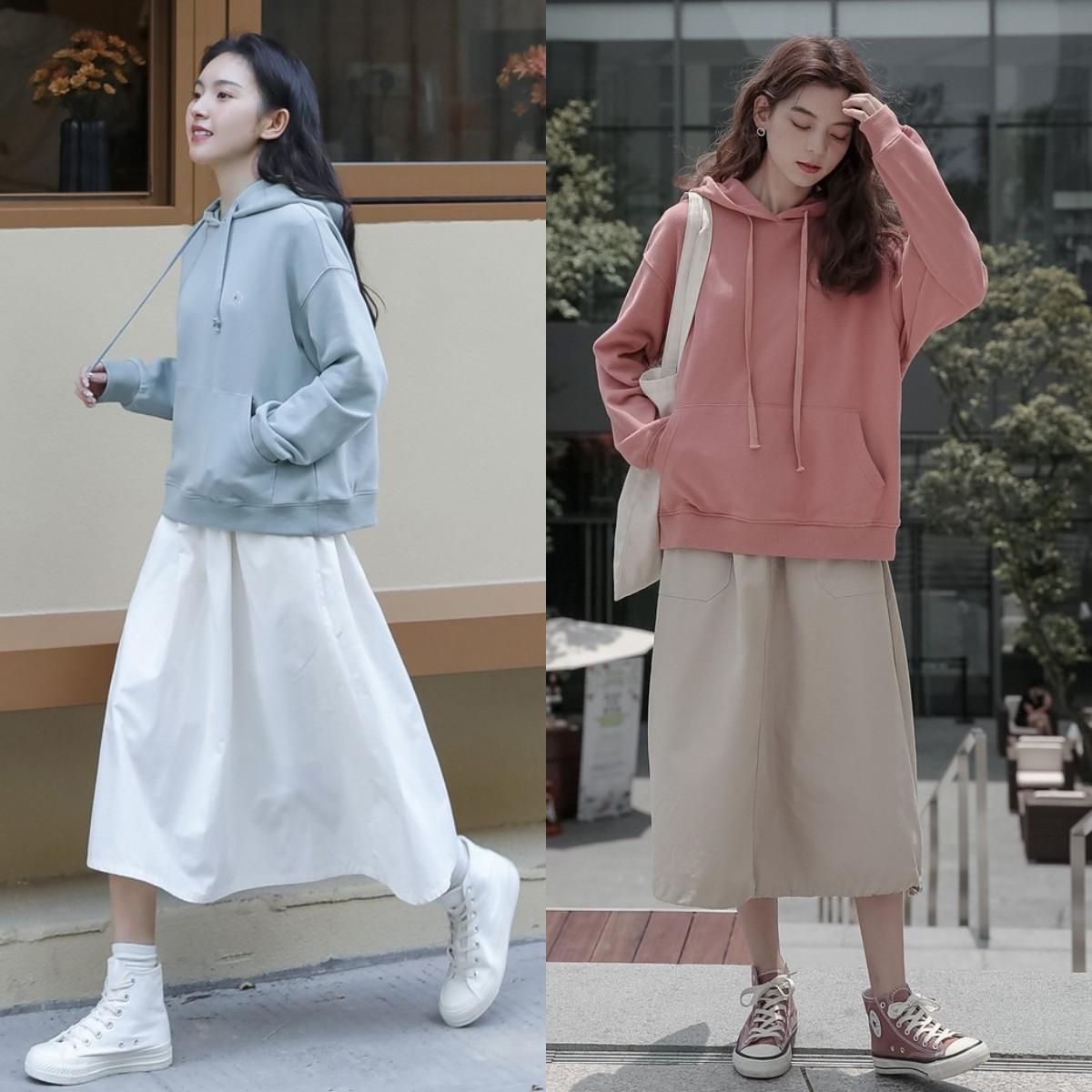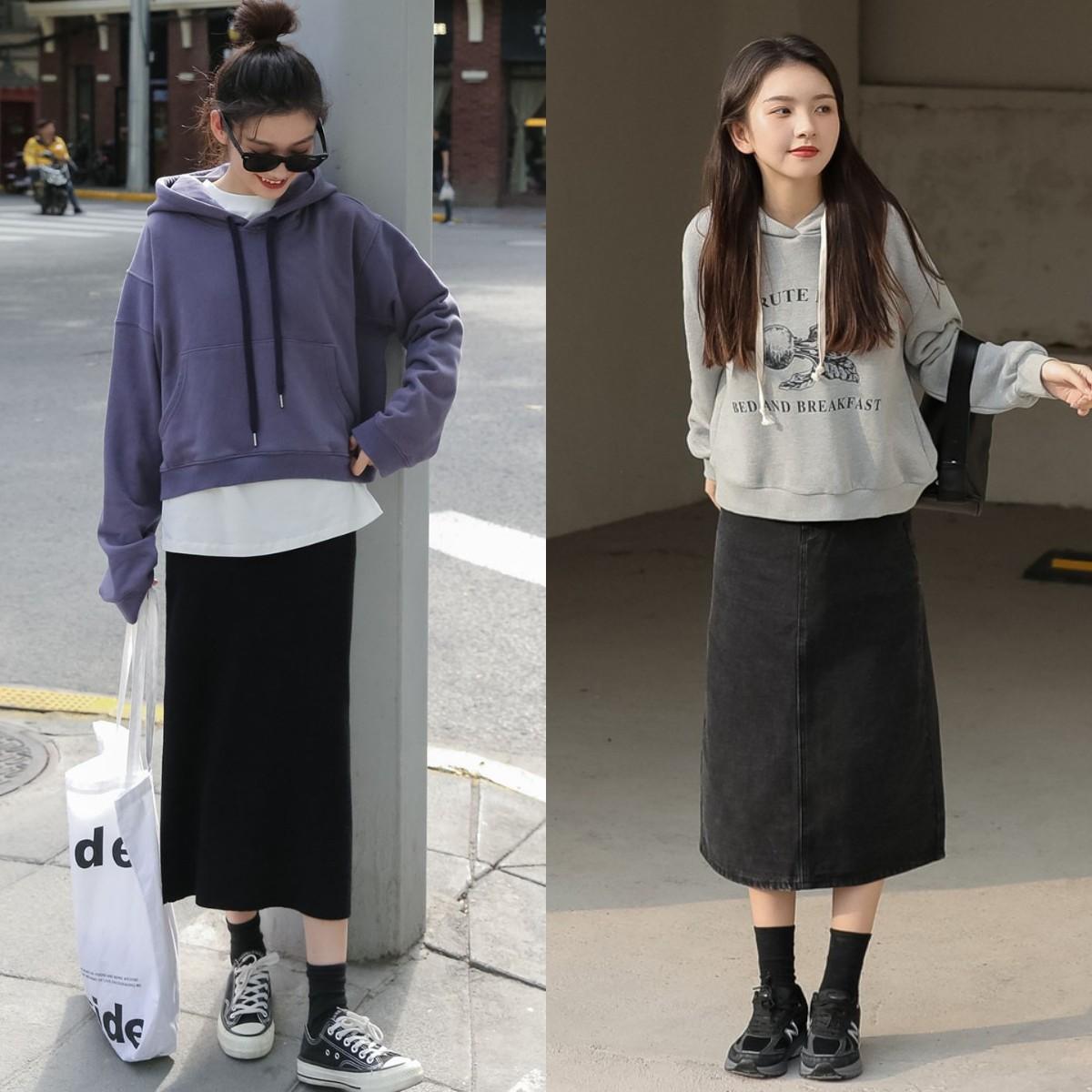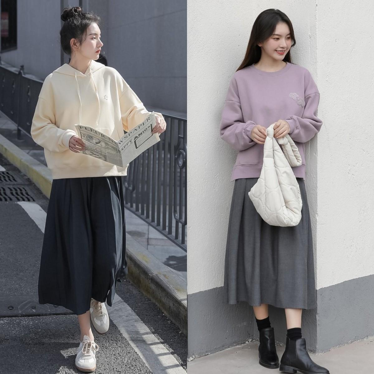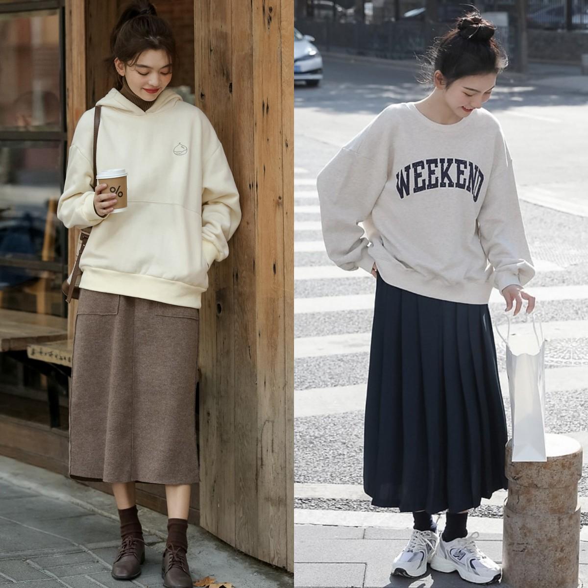 If you still don’t know what to wear, why not try wearing a sweatshirt and a skirt? It can not only meet the temperature needs of the changing seasons, but also create an age-reducing and elegant way of wearing it.