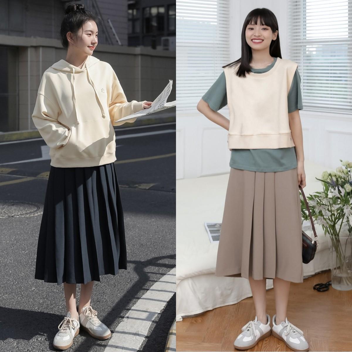 If you belong tothick legs and hips For a wide pear-shaped body, it is best to choose the one in the picture belowThe combination of “half-pleated skirt” and sweatshirt. It strengthens the three-dimensional sense of the skirt and can effectively modify the crotch and legs without feeling bloated.