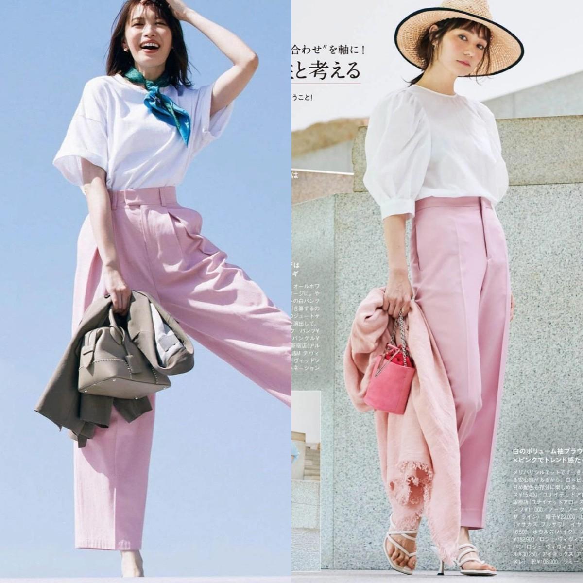 Recommended for white skin The sisters chose the rose pink pants and white T-shirt in the picture below. The rose pink color is very full and rich, and the whitening effect is very good. The white skin seems to have its own filter when worn, and it can easily transform into a cold white. Sisters with yellowish and black skin can choose rubber powder or smoky pink with lower saturation, which is full of gentleness and creates the unique temperament of light-faced girls. and a sense of high-end.