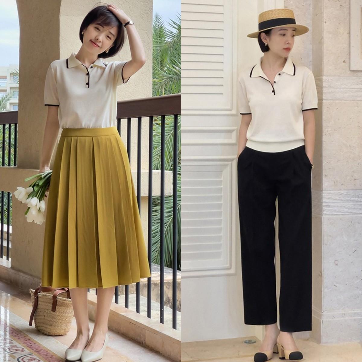 Like the one in the picture belowa small lapel with a “movable button” design T-shirts are a very good choice. While creating a skin-exposing look, they can also well modify the lines of the shoulders and neck, and have an excellent slimming effect.