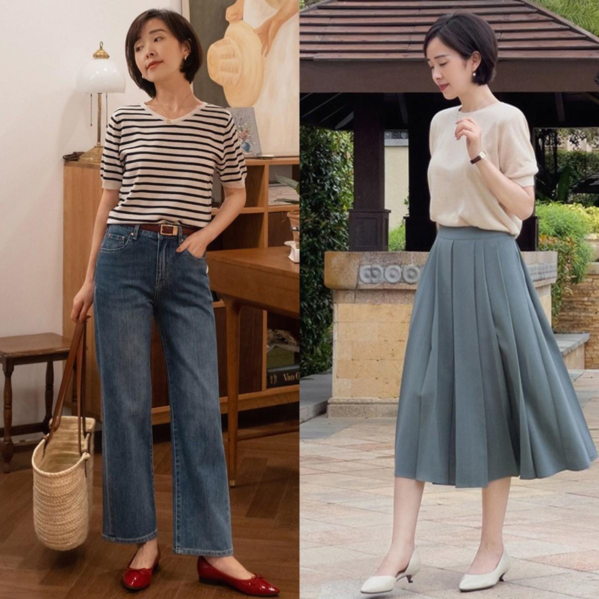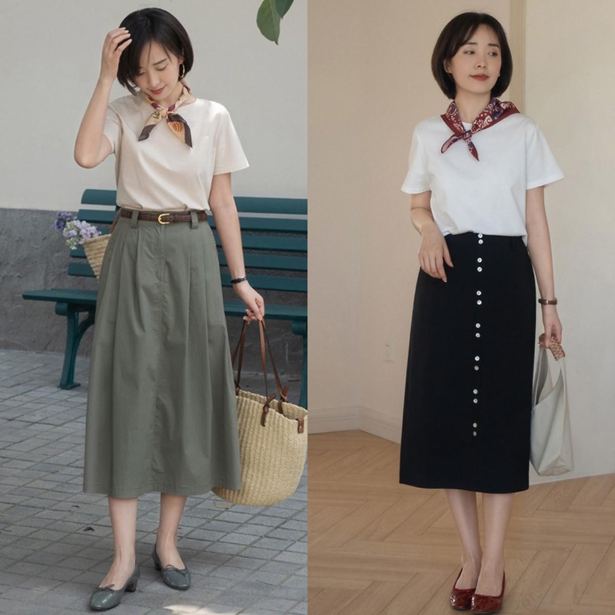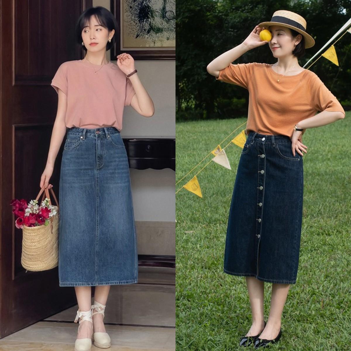 When it comes to specific matching, we can choose according to the type of bottoms, For a pear-shaped figure with thick legs and wide hips, the most unmissable thing is to pair it with a T-shirt and a denim skirt. Denim skirts have a strong three-dimensional effect and can well modify the shortcomings of the lower body. The straight denim skirt in the picture below is a very good choice. When paired with a T-shirt, tuck the hem into the waist of the skirt for a slimming effect!