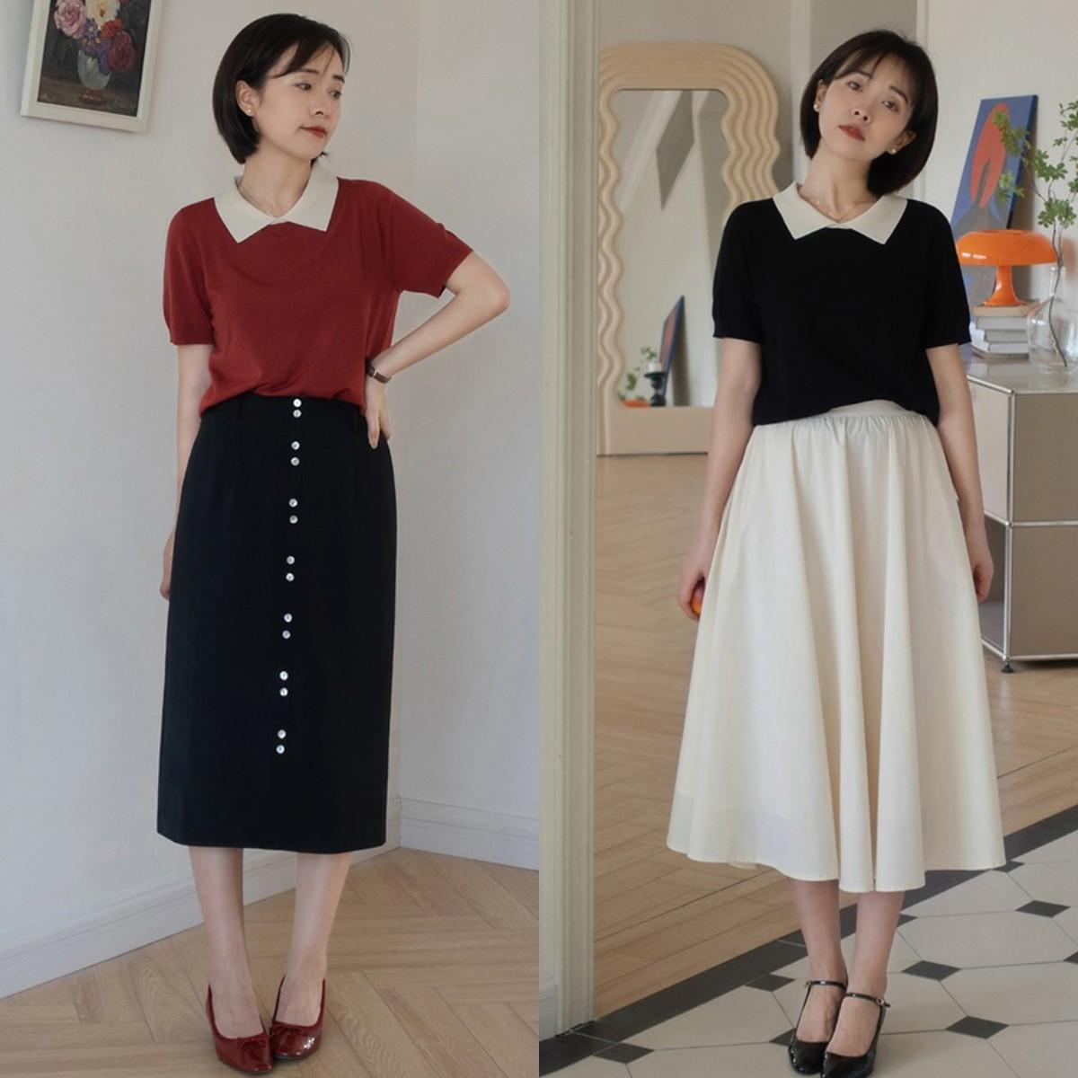 If you want to wear a more retro style, Then you can try matching colorful T-shirts with classic trousers and skirts. For example, the dark red + black, purple + denim blue in the picture below are positive teaching materials, and you can easily create a visual A sense of impact, with a high rate of turning heads!
