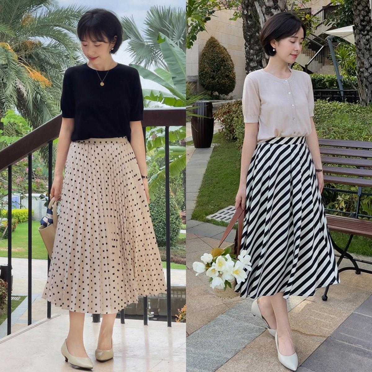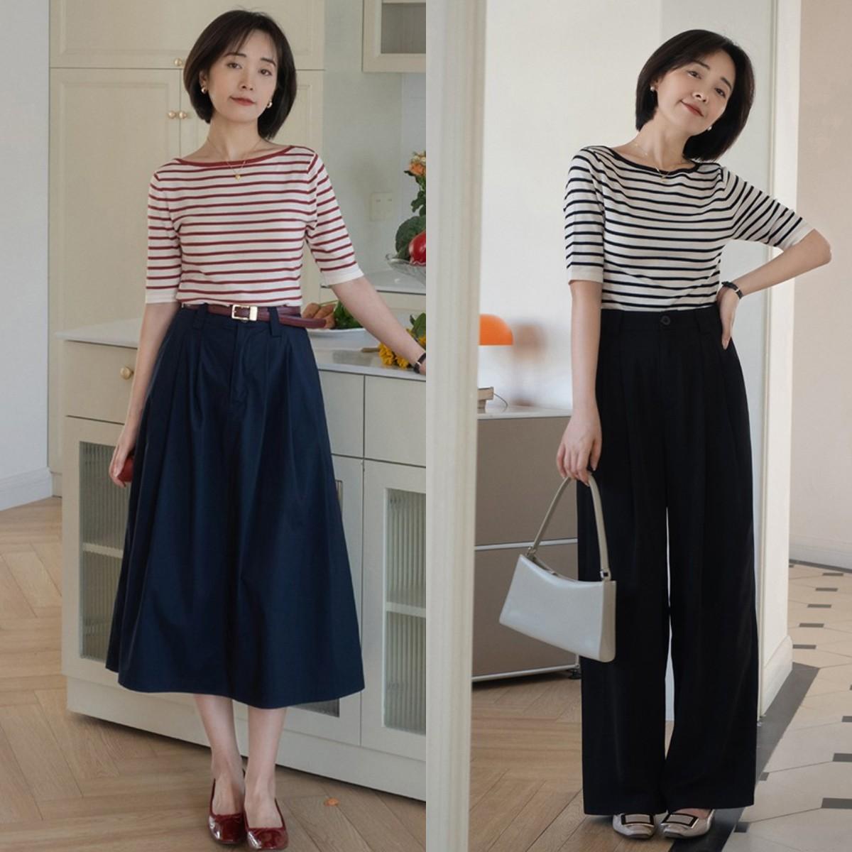 If If you feel that the combination of solid colors is too boring, you can try using a solid color T-shirt with bottoms with multi-color splicing elements to create a “traditional and simplified” contrast effect, which will look good More eye-catching. If you are over 30 years old, you can try Bottoms with polka dot elements and striped elements paired with a solid color T-shirt, which can not only enhance the visual impact, but also Create a French-style effect.