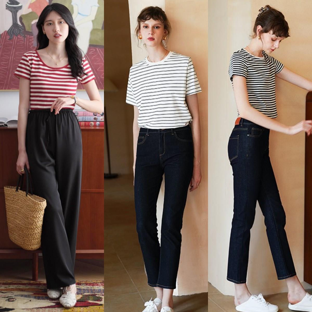If you want to wear a more elegant look, it is recommended that you try the one in the picture below T-shirt with striped elements. The quantitative elements are retro and have a sense of elegance, which can greatly reduce the T-shirt collision rate. It is very suitable for women in their thirties and forties. It can be worn to easily create a look with excellent elegance.