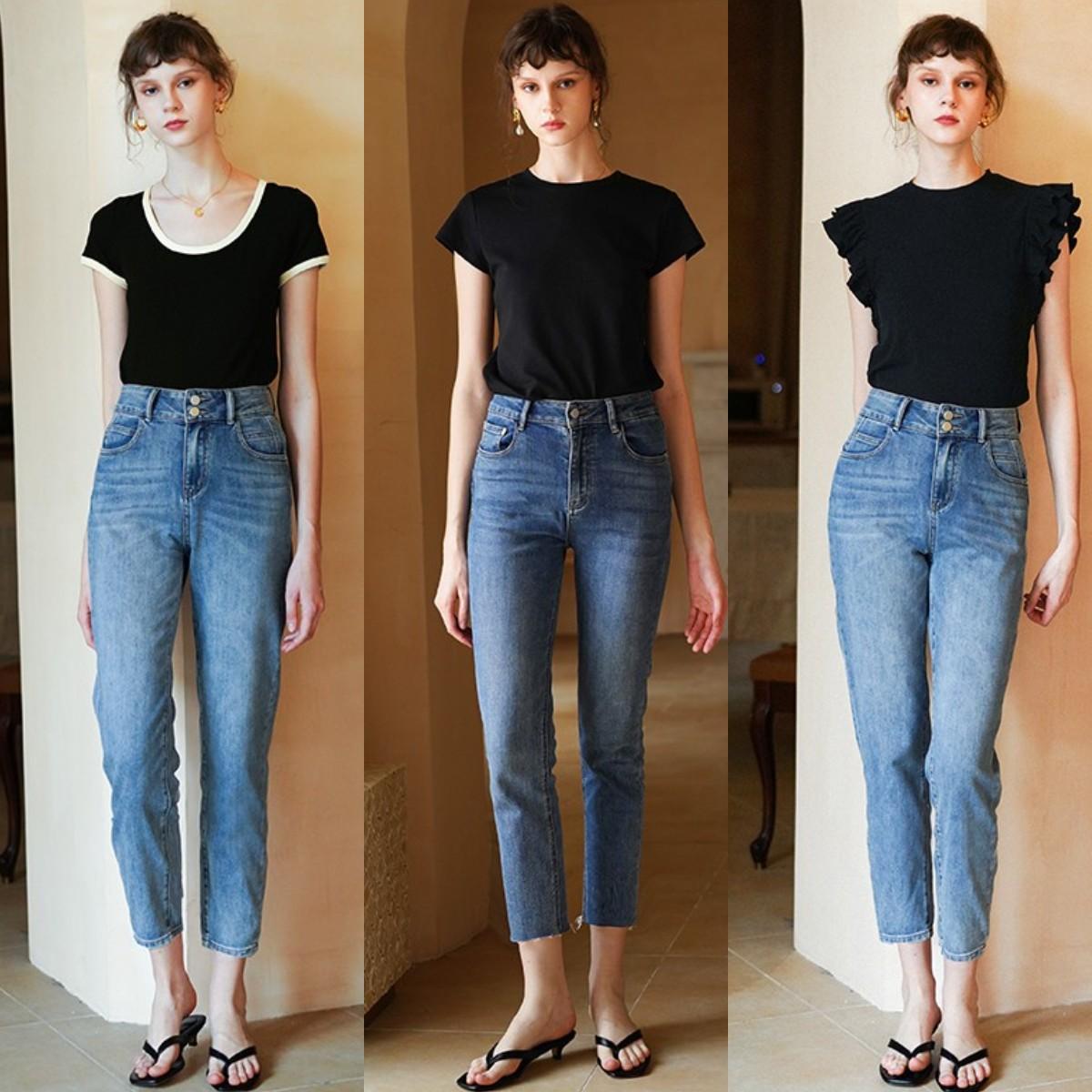 The combination of T-shirts and jeans is not uncommon in summer. It is casual and age-reducing, and is suitable for a wide range of age groups. If you are over 30 years old, you can choose 9-point jeans with “high waist design” and small legs. This style of jeans is more streamlined and can modify the shape of your legs. It can be easily controlled whether you have O-shaped legs or X-shaped legs.