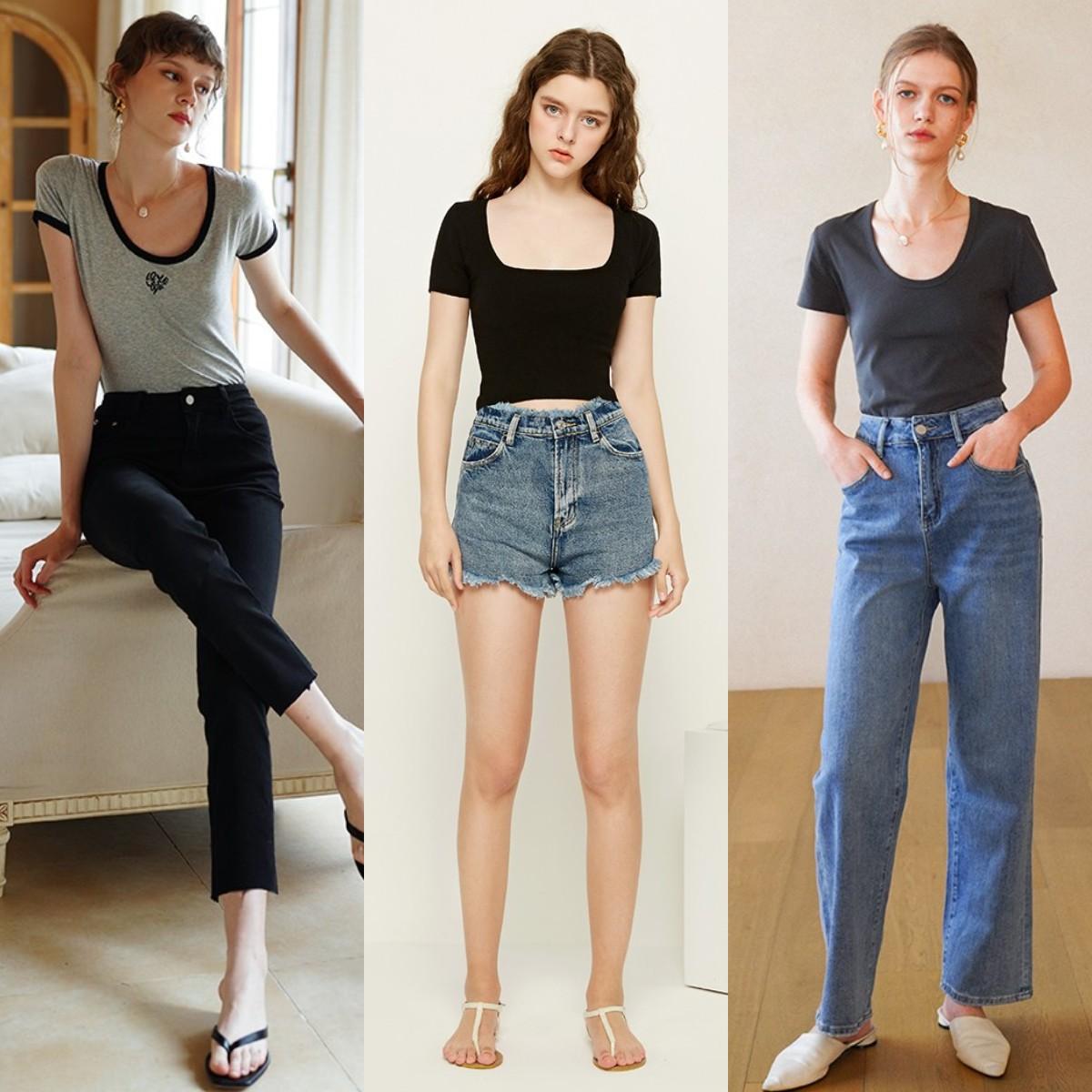 T-shirts are not uncommon in summer. If we want to reduce the rate of collision, we have to make some adjustments in style selection. If you want to wear a more feminine look, it is recommended that you try a T-shirt with a larger neckline, such as the Big U-neck T-shirt and square-neck T-shirt in the picture below T-shirtis a very good choice.