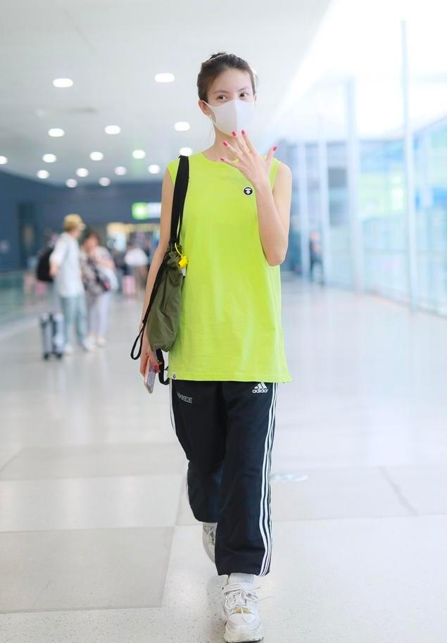 Fluorescent colors are particularly difficult to control Yes, but it looks very youthful and eye-catching when worn on Jin Chen, especially this basketball vest-style top, which is also very cool. The lower body is a pair of loose sports pants and a pair of sneakers on the feet. Overall, it is sporty. Very breathable