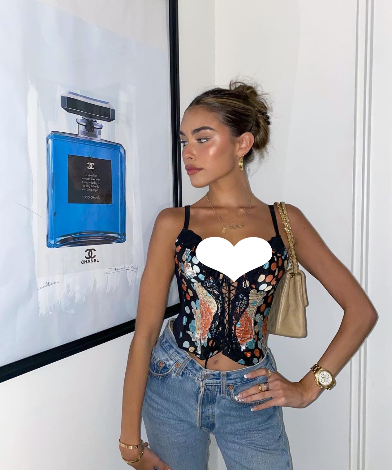This set is really a hot girl for anyone with a discerning eye. The embroidered top with suspenders, the lace-up top, and the tight The style, paired with a low-key and versatile item like jeans, can’t escape the word sexy.
