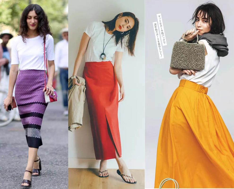 A brightly colored skirt paired with a simple basic T-shirt can make an ordinary T-shirt look more classy. , the overall color matching also makes your style more interesting and visible, making your outfit more attractive and improving the overall fashionability.