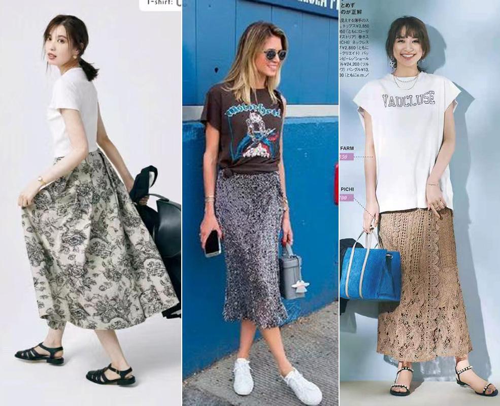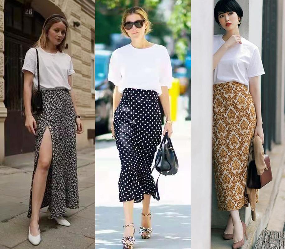 For example, a basic white tee or a cool rock-style black tee can be paired with a unique retro satin printed skirt , a feminine sequin hip skirt, or an exquisite lace skirt. These skirts are exquisite and gorgeous. Even if the T-shirt on the upper body is ordinary, the overall outfit still shows a very high-end temperament, casual yet elegant and feminine.