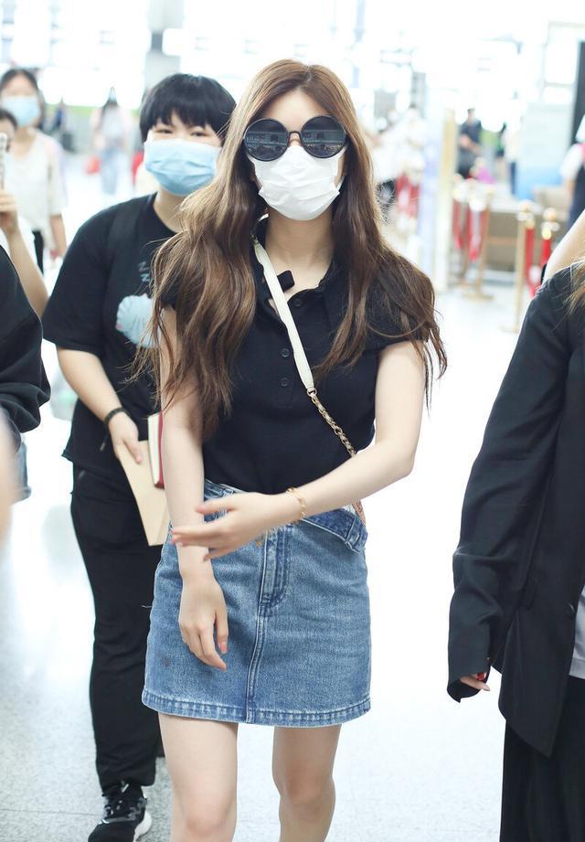 Zhao Lusi is really a cute and trendy girl, even wearing denim skirts is very attractive. Zhao Lusi’s denim skirt is too slim, and the black POLO shirt is simple and neat, and has a really good temperament. Zhao Lusi’s matching is fresh and simple, but the design of neither the POLO shirt nor the denim skirt is simple, so the overall matching trend is very prominent.