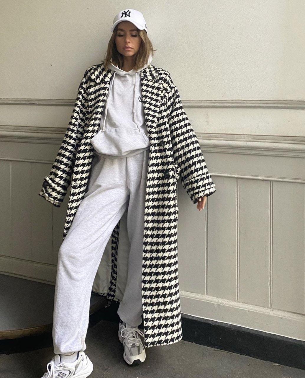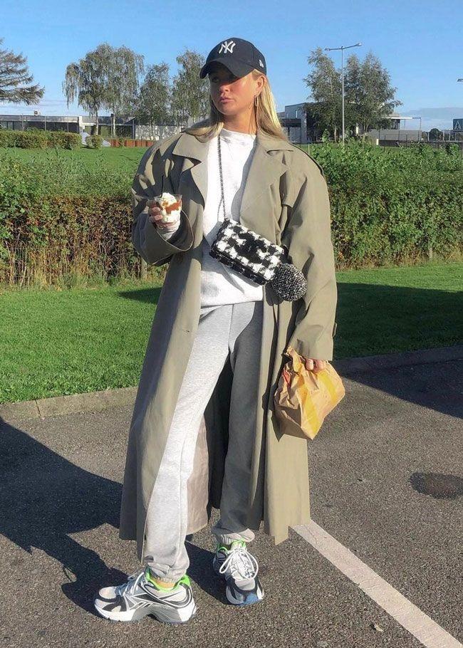 The houndstooth trench coat is still very beautiful. It has the feeling of a wealthy daughter, and she looks super rich! It is paired with a set of gray sportswear and gray sneakers. The peaked cap enhances the sense of sportiness and makes it appear younger. When paired with a coat, it gives it a bit of a ladylike temperament.