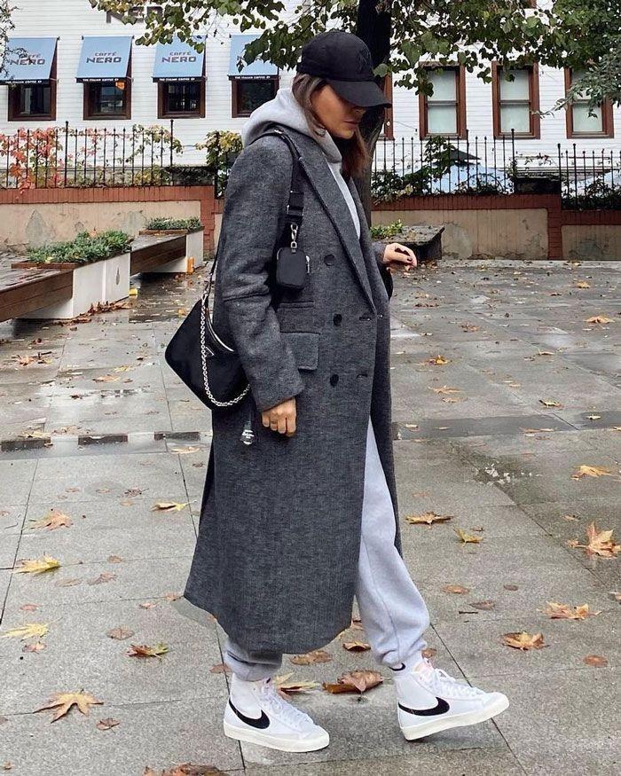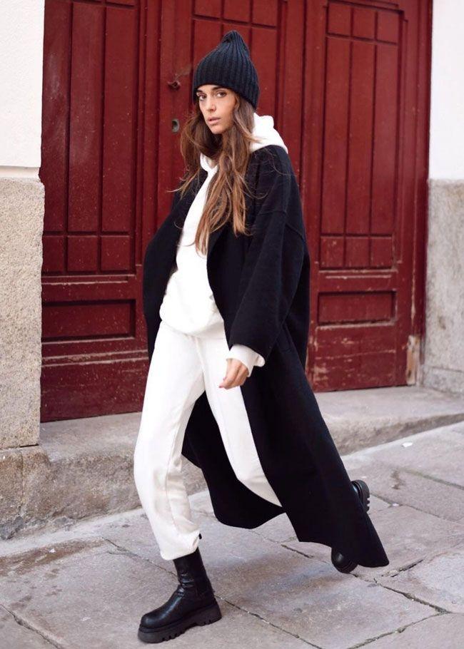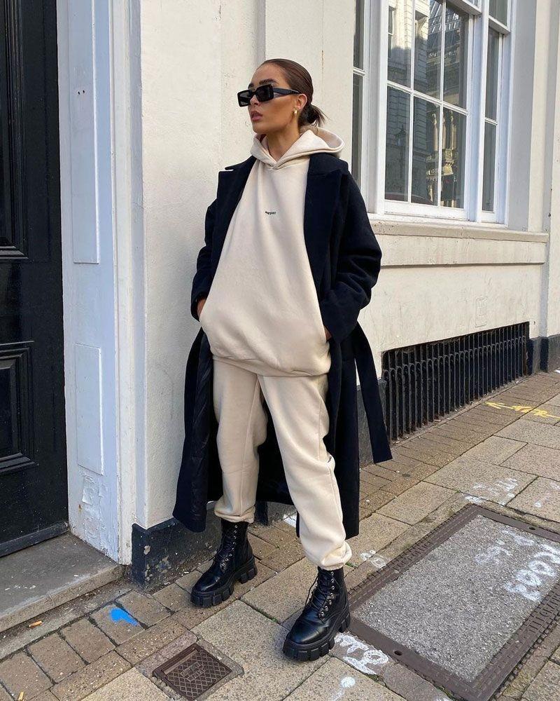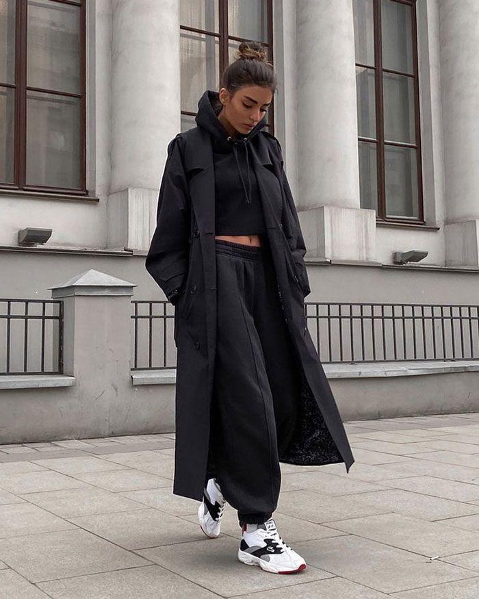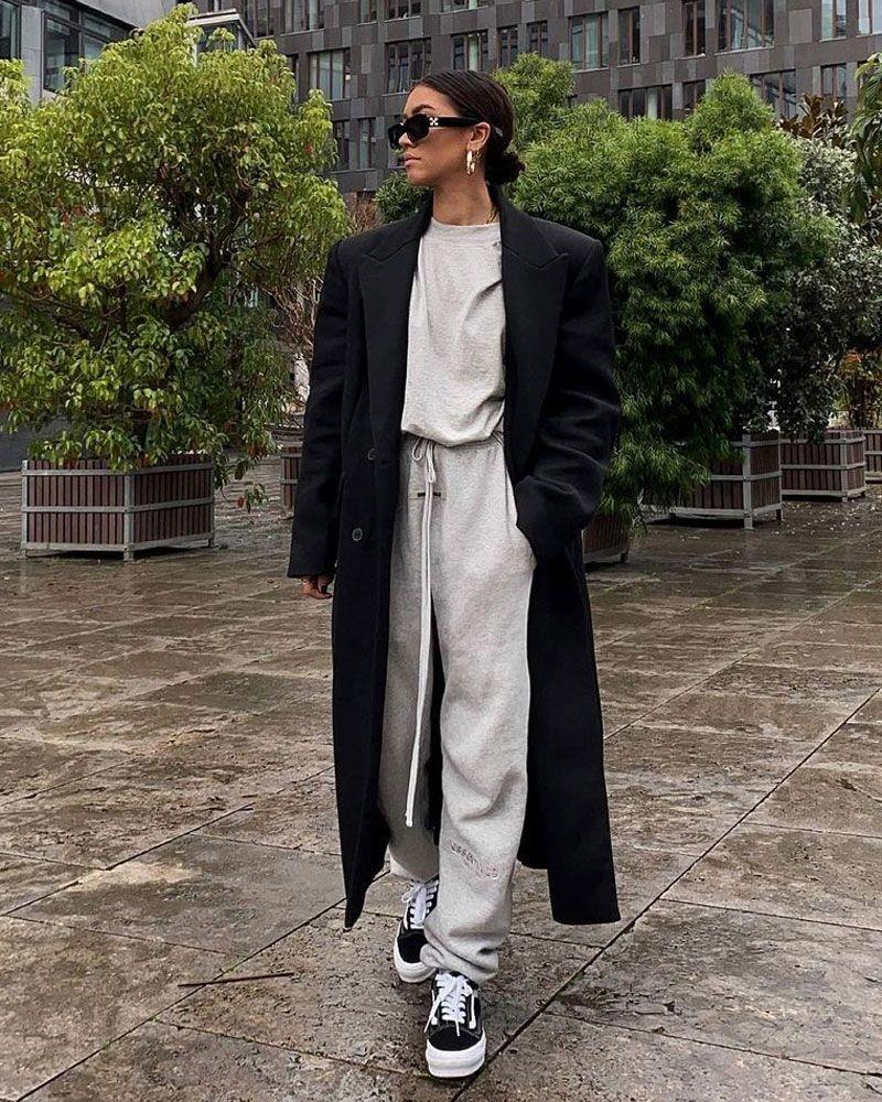 I have to say that the combination of these two items is stunning! You can choose a solid color for your coat, especially black which is more versatile. You can wear it with a combination of sweatshirt and sweatpants, which looks casual and sporty. If you take off the coat, you can do sports activities. If you put on the coat, it will be a trendy match.