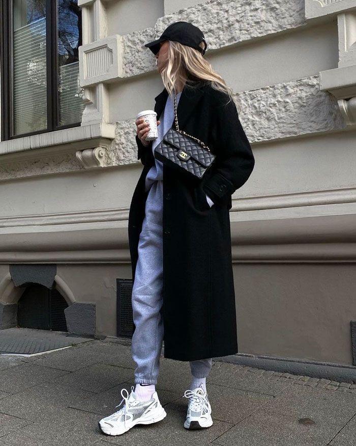 The main feature of this outfit is the combination of a coat and a bag. The bag has sharp edges and corners and looks a bit aggressive, especially when paired with it. The black sweatshirt is very aura in terms of color. It is paired with gray sweatpants and sneakers, which also has its own vitality. This simple color matching is also super stunning.