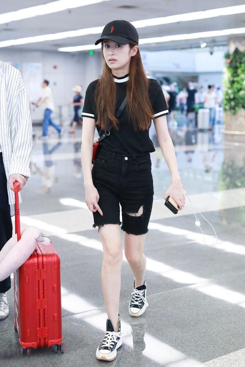 When choosing ripped shorts, you can choose a little higher than the knee. This length isShe looks taller and can also highlight her good figure. Her legs are thin and white, which is very enviable. She looks cool and sassy in black.