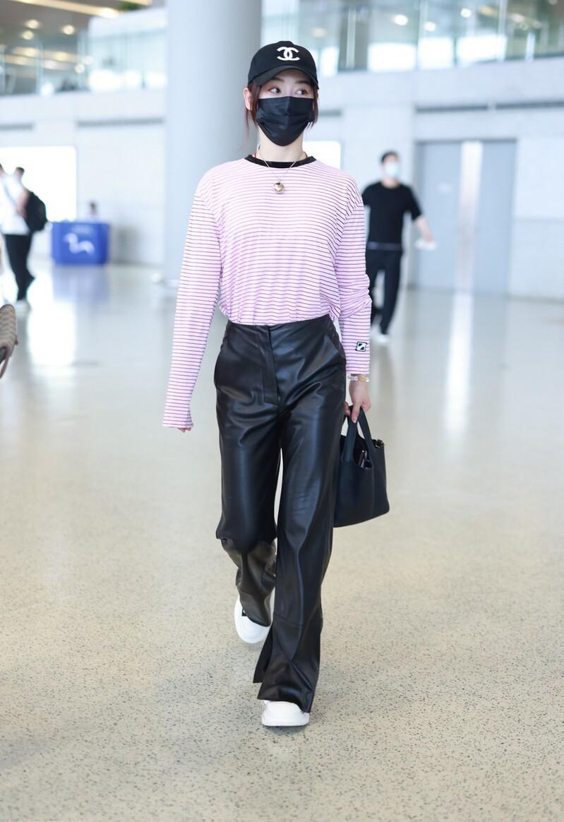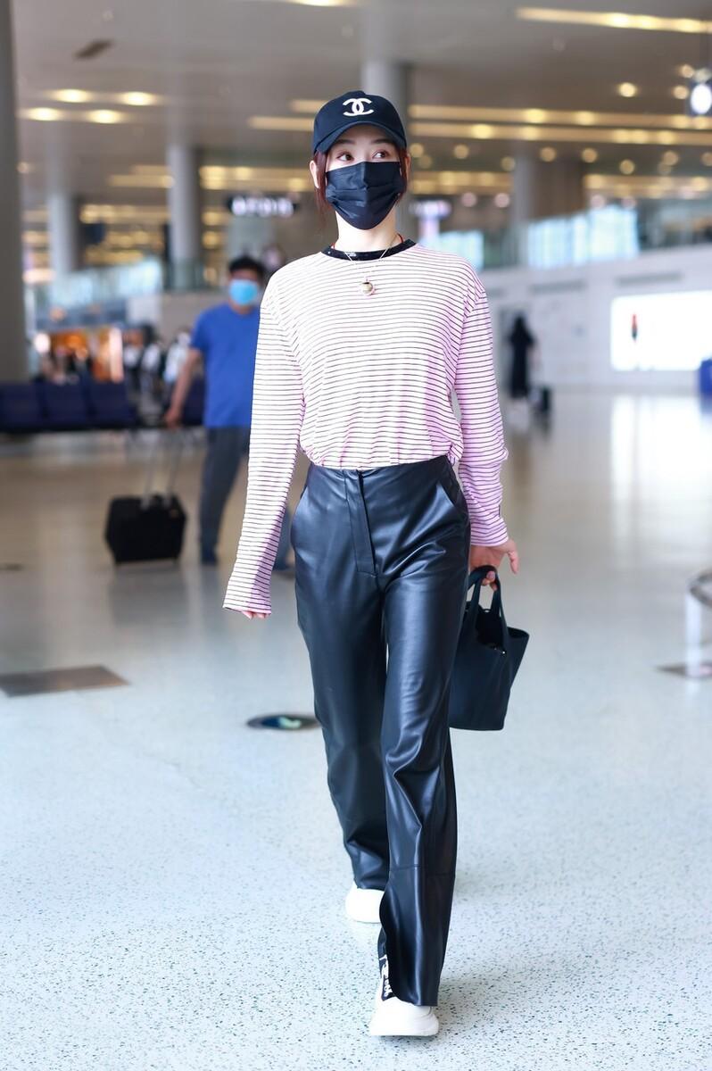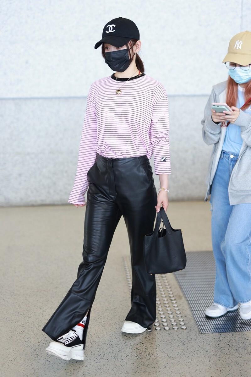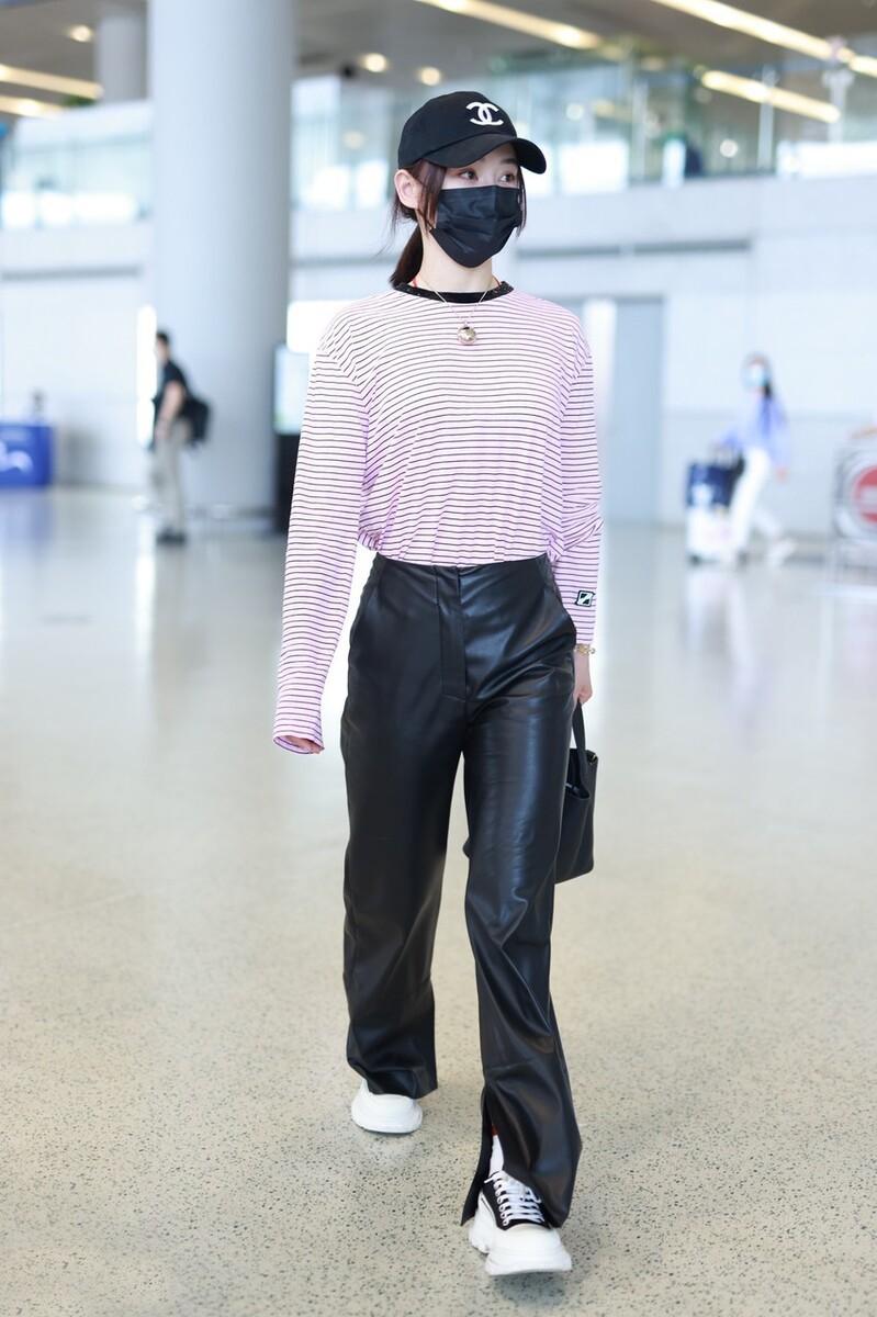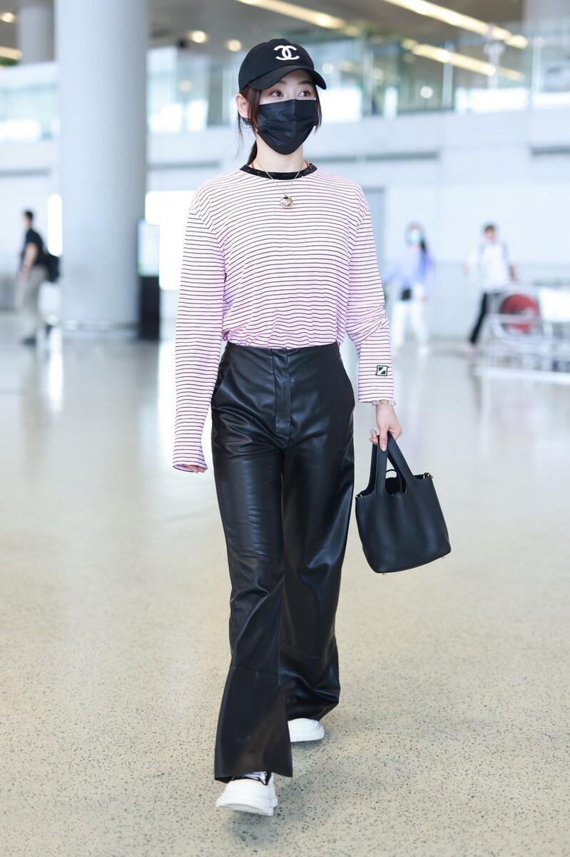 The leather pants chosen by Yuan Shanshan are naturally not conventional basic styles. The novel style design she adopts is really eye-catching, and the matching of tops is also appropriate. , the thick leather pants and light striped T-shirt are harmonious and elegant.
