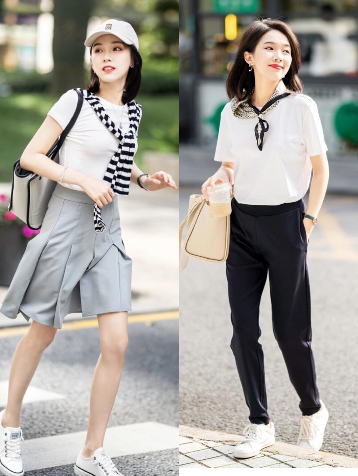 Solid color T-shirts are a style favored by many girls because they are less likely to fall over. However, if you want to look more fashionable, wearing a solid color T-shirt alone may be difficult to achieve the desired effect. At this time, we might as well prepare a silk scarf to wear around the neck, which can add the finishing touch and make the color sense stronger. Or you can choose a lighter long-sleeved shirt as a shawl to make the outfit more layered and brighter.