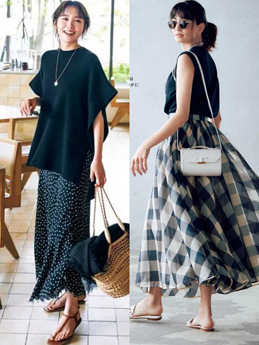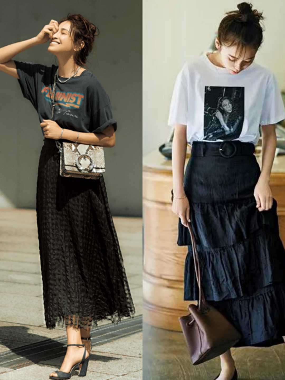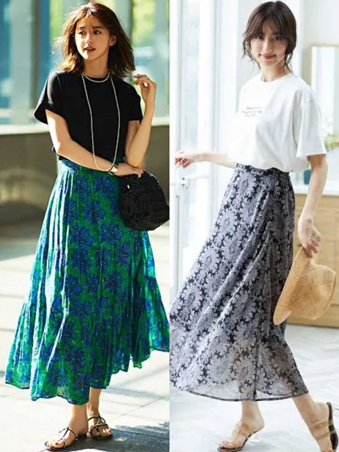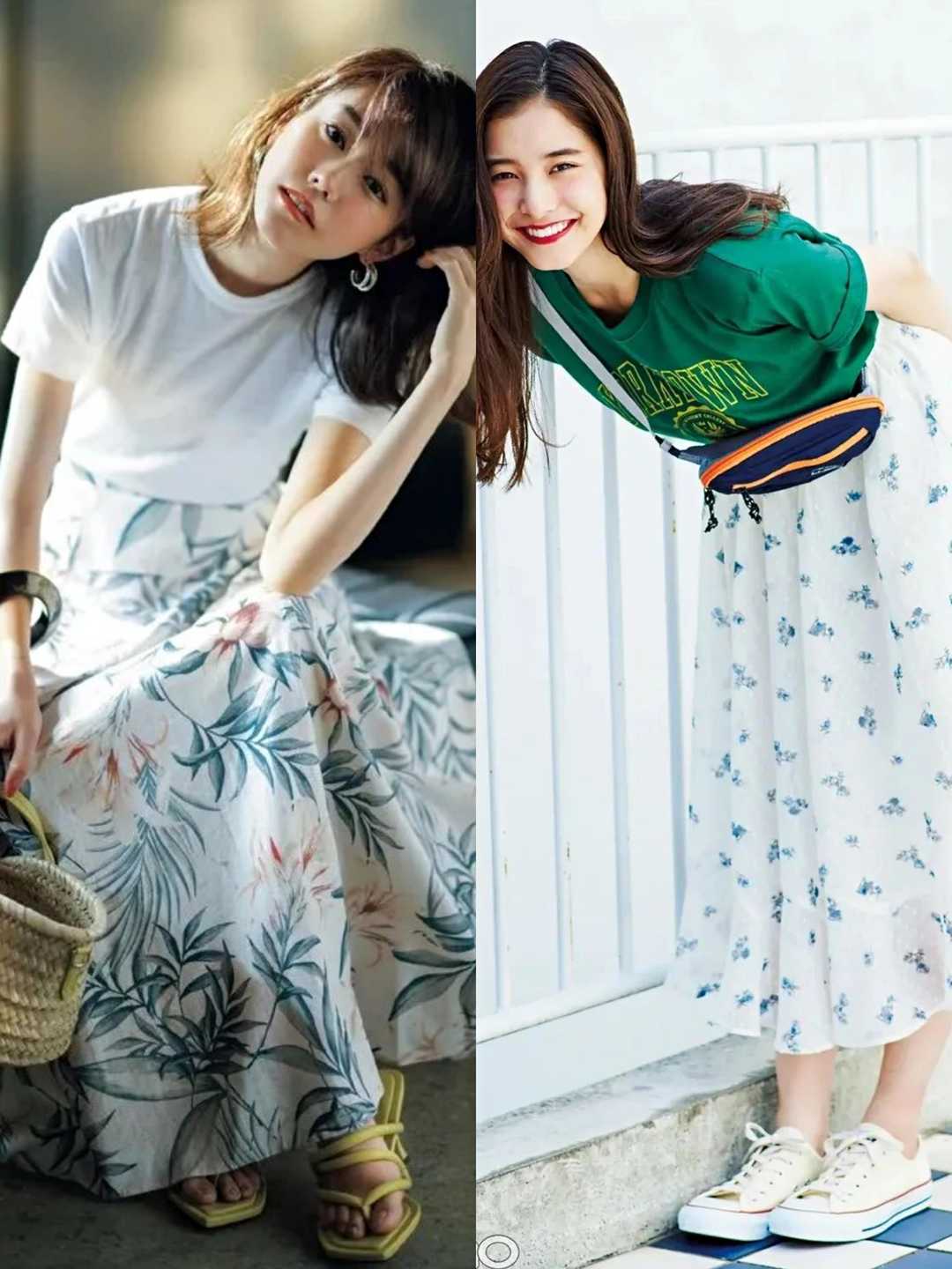 The T-shirts worn by these young ladies on their upper bodies are also basic black and white, which are indeed versatile. The colorful printed skirts worn on their lower bodies will not feel cluttered at all.