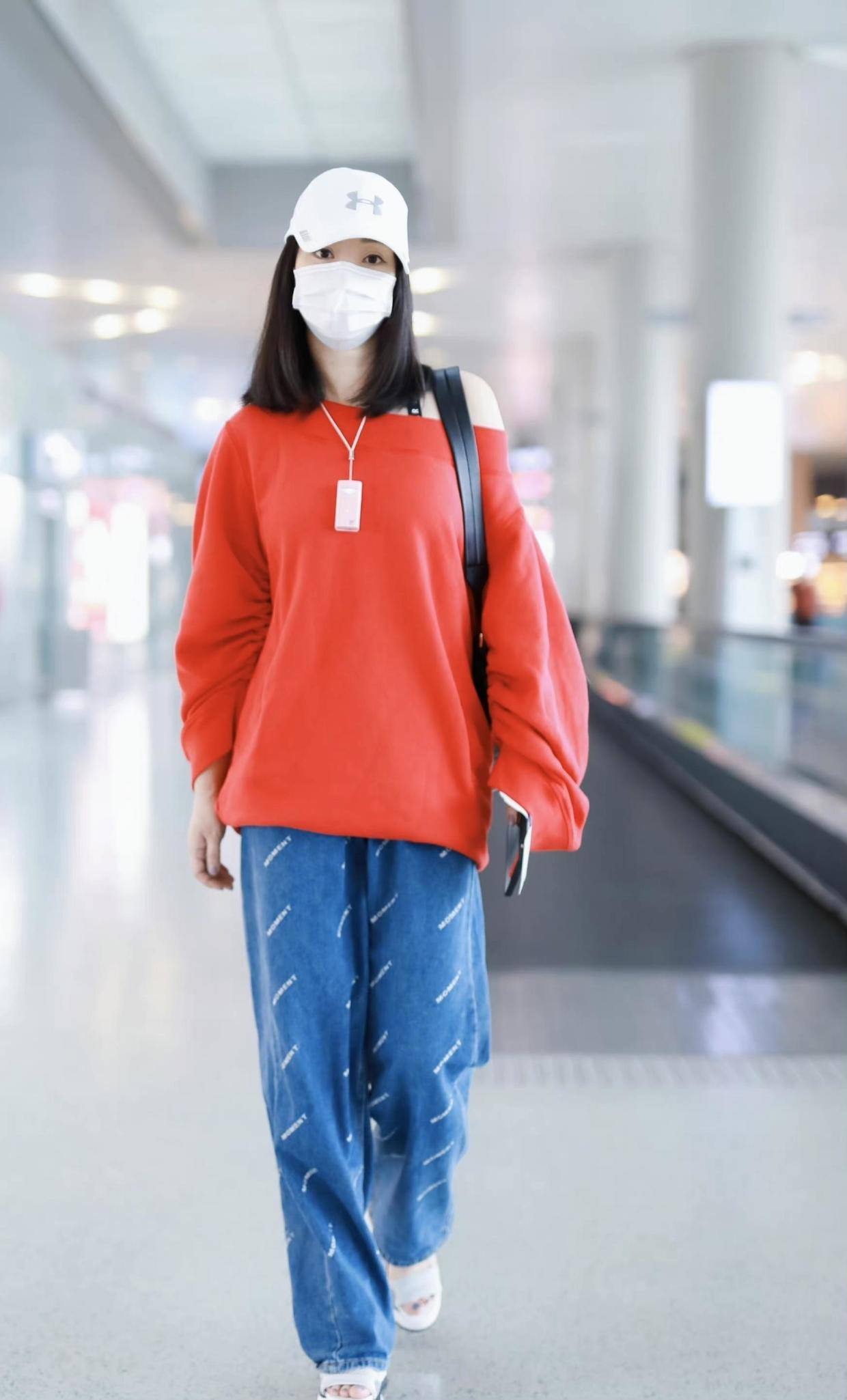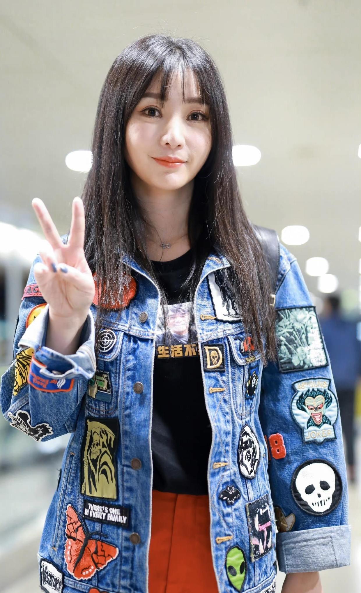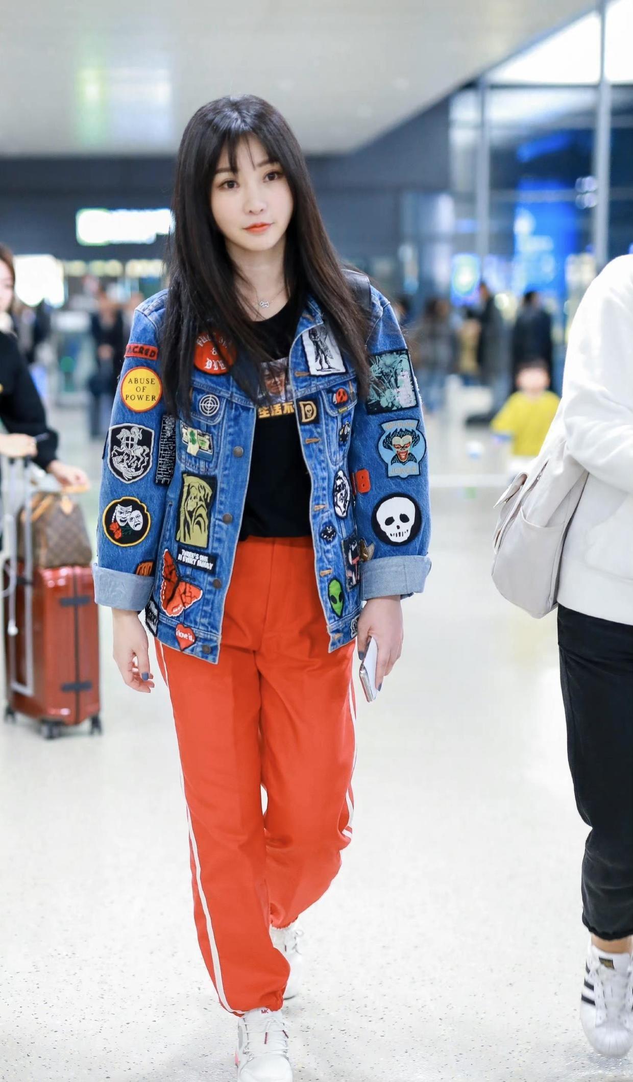 Liu Yan paired herself with a fashionable black T-shirt, combined with this printed denim jacket, it looked really fashionable , this kind of casual style items match each other, making her look very young and more elegant. The lower body paired with red sports wide-leg pants will also show full of youthful vitality.