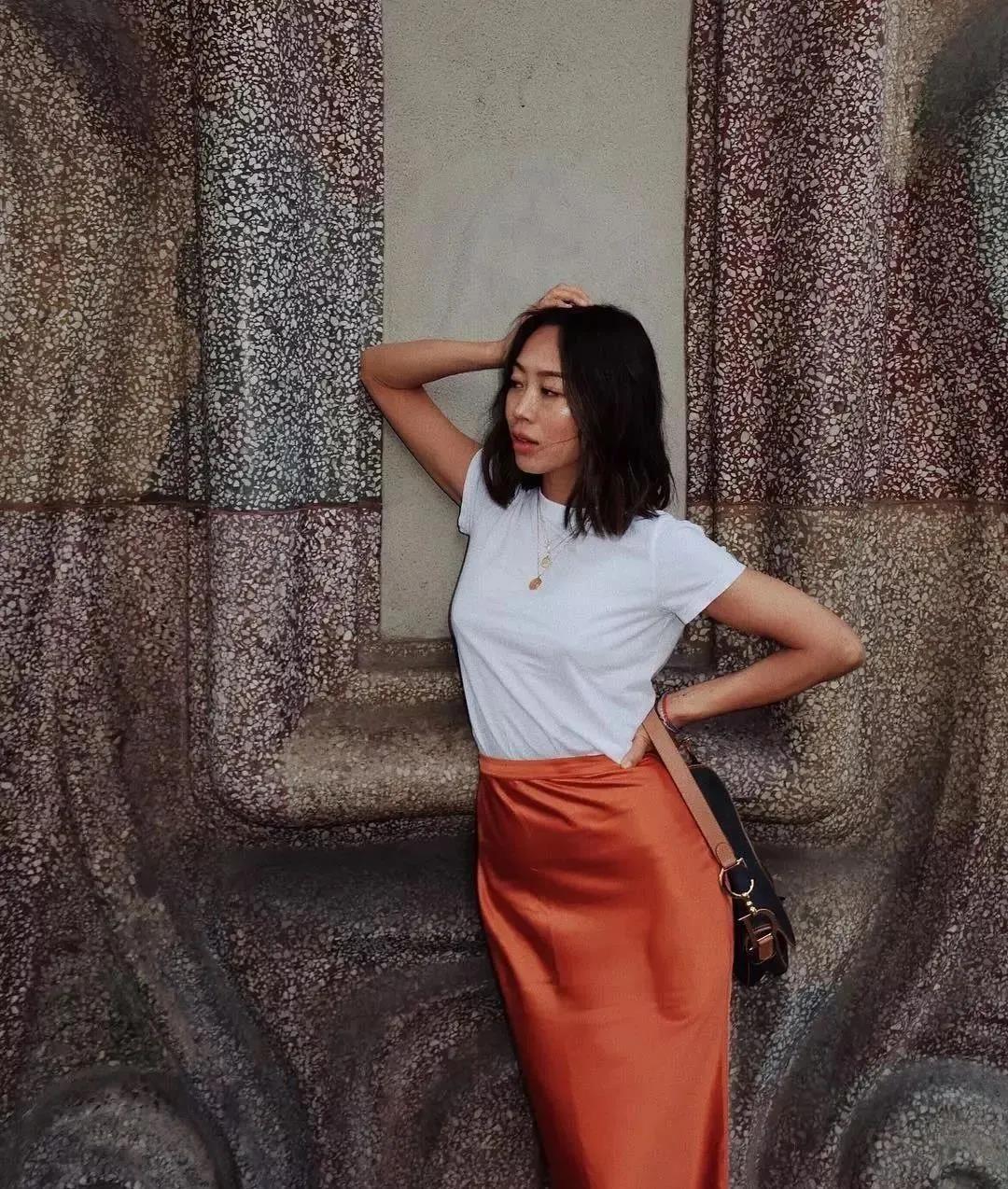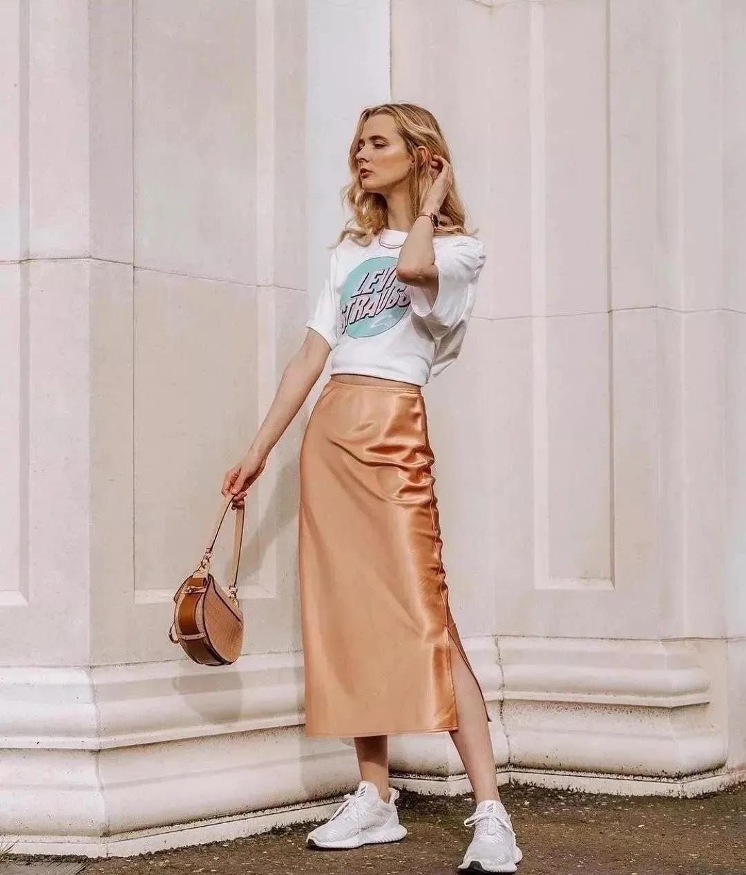 Generally speaking, silk skirts have a slimmer design, so relatively speaking they are more suitable for girls with a better-looking lower body. Pairing a light champagne slit skirt with a white letter T-shirt is like a combination of Grandma and Anta. They seem to have nothing to do with each other, but they are particularly surprising when paired together.