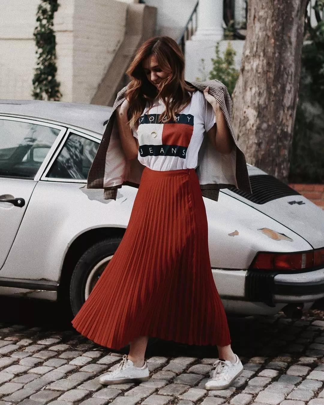 The pleated skirt is both age-reducing and romantic. If it can be made to cover the buttocks, it will be even more sexy. Because it is entirely red, you should also pay attention to the color echo when choosing clothes. A style like this that only reveals a little bit will increase the overall freshness. Finally, paired with white shoes, you can easily create a new sexy style in the workplace.