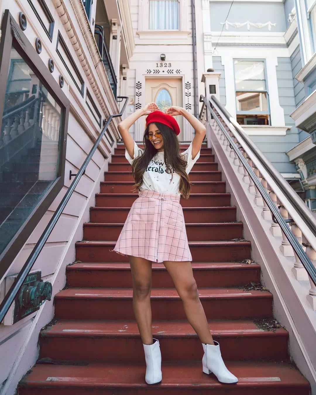 The plaid pattern will have a more retro feel, especially the lines that are more distinct. What does it mean to have clear lines? There is a clear difference between the color of the plaid and the background color of the skirt. Then pair the upper body with a white lettered T-shirt, which will make you look particularly delicate, youthful and girlish.