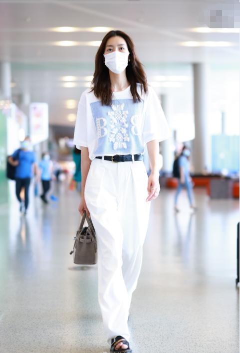 The T-shirt Liu Wen wears is very simple, but it has a certain print design, but it is not exaggerated at all. The color combination of white and blue is used to interpret the fashion sense and match It is also a pair of pure white straight pants, with only a black belt as an embellishment. It does not have much skill, but it makes the white shirt look very fashionable. It is the real king if it is loose and just right.