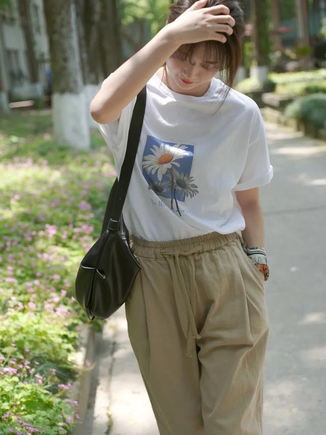 In fact, a simple white T-shirt will not look inconsistent when paired with simple trousers, and it is fashionable enough for daily wear, such as this white one with printed elements. It is simple, the lower body is in khaki trousers, using the colors to create a sense of hierarchy, and the combination of shades, which is fashionable and elegant.