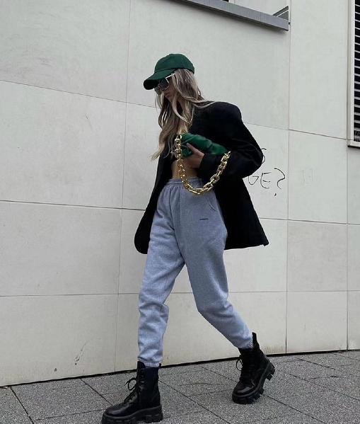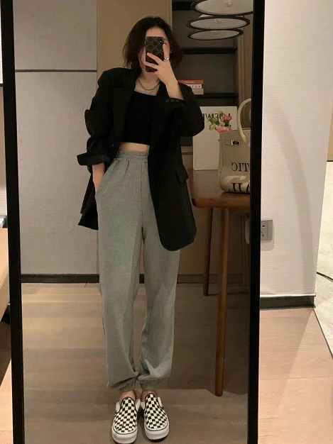 In the mix and match combination of spring,the combination of cool and capable suits and casual sweatpants , which can not only show a capable temperament, but also achieve the effect of reducing age, giving people a capable and uninhibited sense of coolness, and easily grasping the beauty of street fashion.