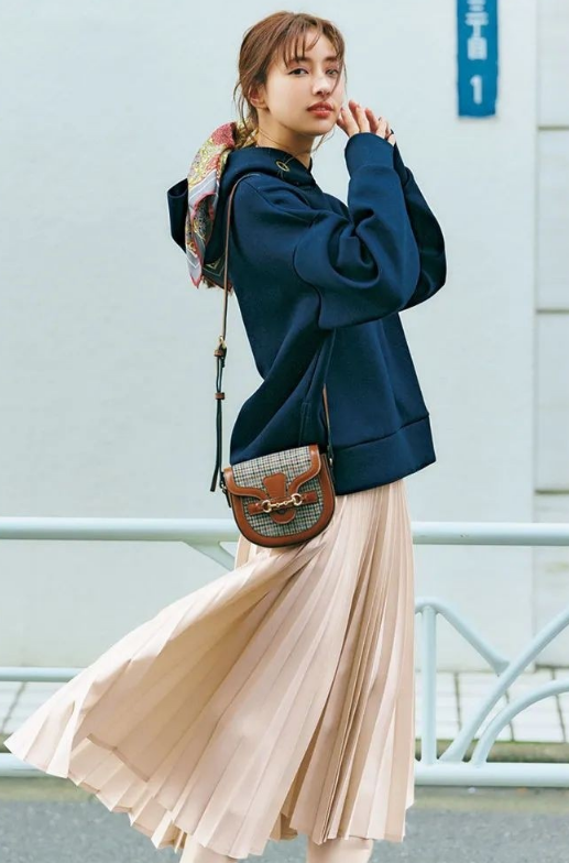 Many fashion bloggers admire Riza’s style Yes, how to wear a sweatshirt with a pleated skirt. This style is actually a popular outfit, because the sweatshirt itself is loose and very long. When paired with this style, there are elegant pleated skirts and two loose and long items. In reality, whether it is a tall girl or a short girl, The girls don’t look good in driving, and they look very rustic.